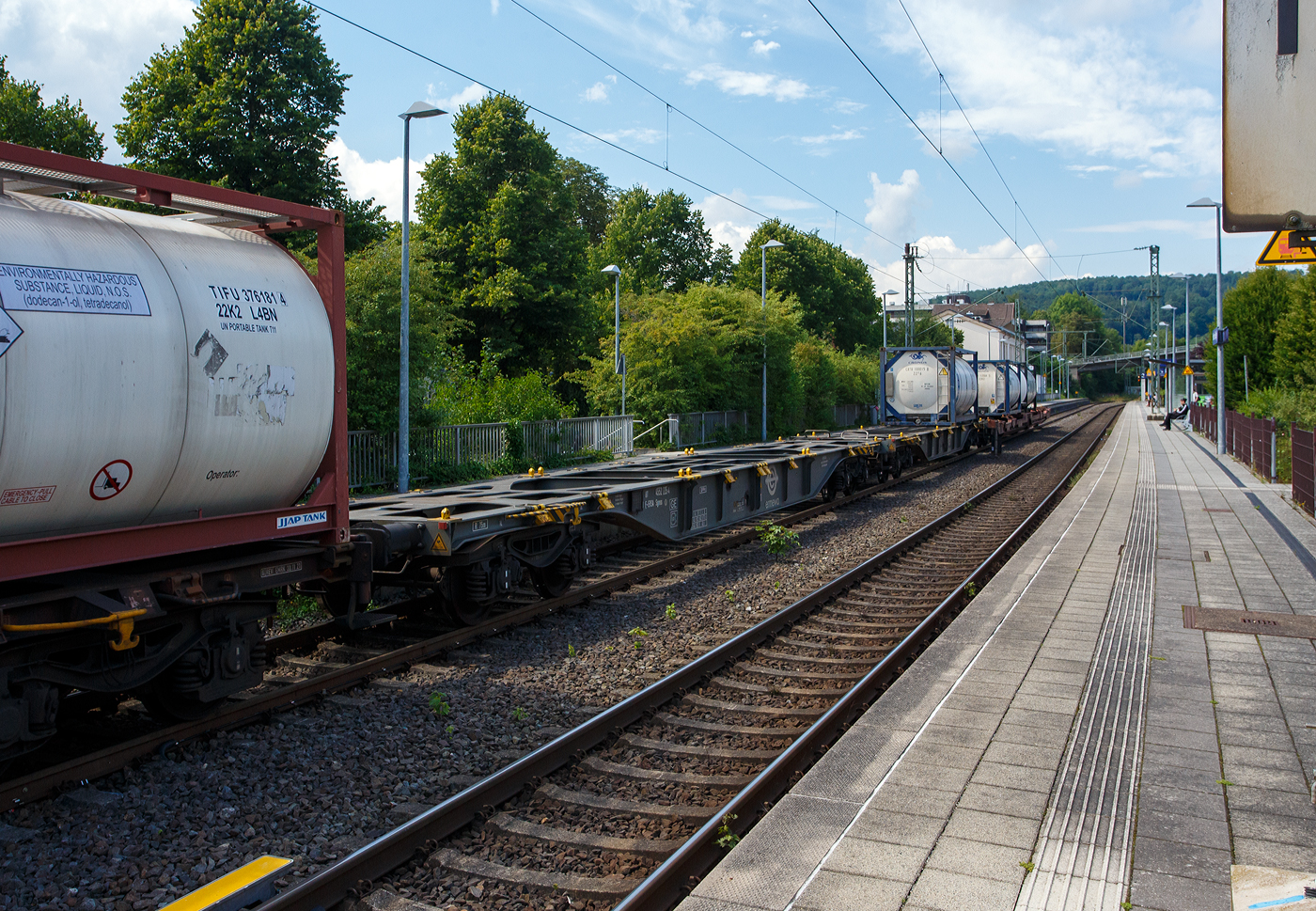 Vierachsiger Drehgestell 117 m³ Druckgaskesselwagen ohne Sonnenschutzdach, 33 87 7811 307-0 F-ERSA, der Gattung Zags (Safety++), der französischen Ermewa SA, laut Anschrift ist der Wagen leer und mit Stickstoff (Nitrogen) gespült, am 17 Juli 2025 im Zugverband bei einer Zugdurchfahrt in Kirchen (Sieg) in Richtung Köln.