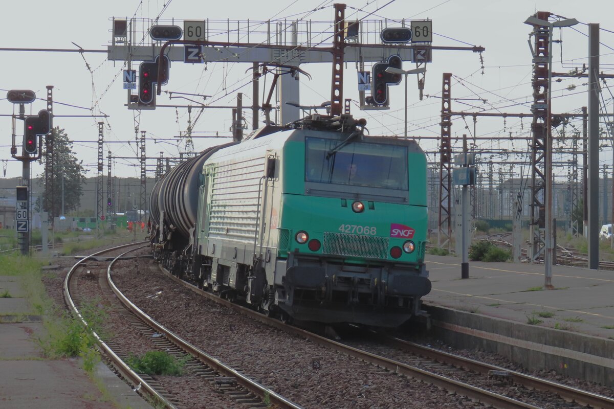Die SNCF BB 27067 bzw. BB 427067 (UIC 91 87 0027 067-4 F-SNCF hat den Getreidezug nach Italien nachgeschoben und verlässt ihn nun in Vallorbe ohne fremde Hilfe, da die Rangierfahrstrasse auf die SNCF Fahrleitungsspannung umgeschaltet wurde. An der Spitze des Zugs wird in der Zwischenzeit die BB 26068 von der SBB Re 6/6 11688 manövriert und in den 50 Hz Bereich zurück gestossen.