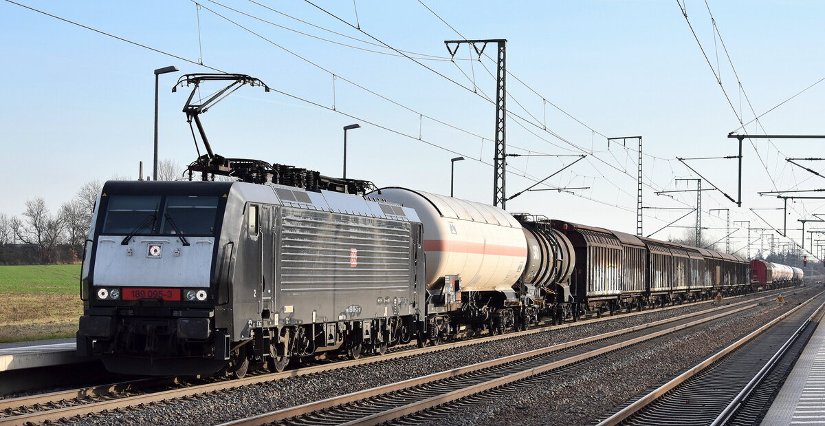 DB Cargo AG, Mainz [D] mit ihrer "187 154" [NVR-Nummer: 91 80 6187 154-0 D-DB] und einem gemischten Güterzug am 23.04.25 Höhe Bahnhof Saarmund.