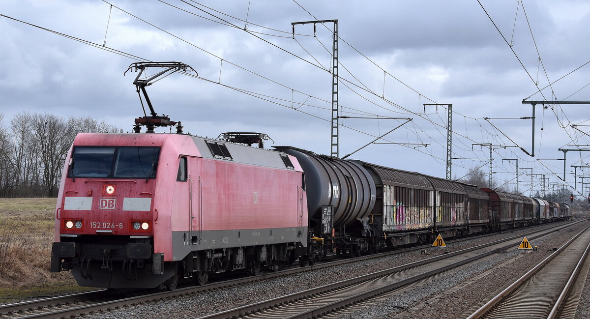 DB Cargo AG, Mainz [D] mit ihrer "185 283-9" [NVR-Nummer: 91 80 6185 283-9 D-DB] und einem gemischten Güterzug am 24.02.26 Durchfahrt Bahnhof Dessau Hbf.