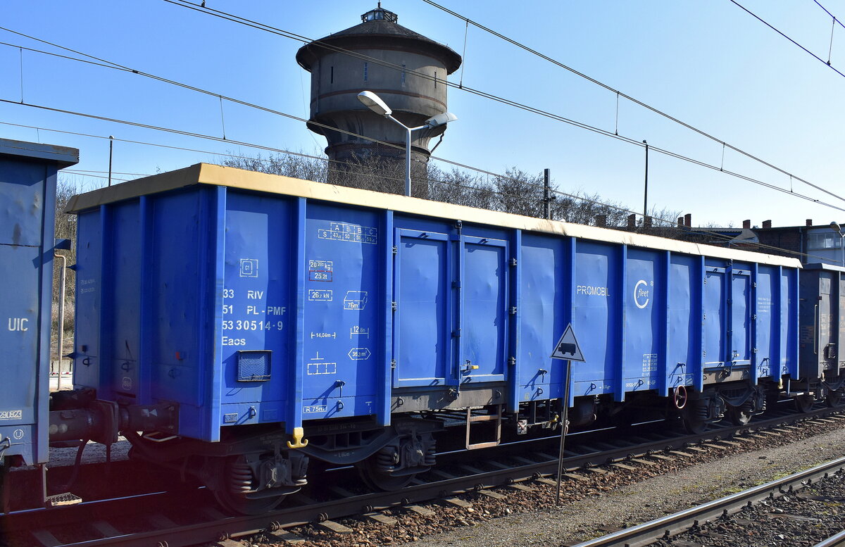 Polnischer Drehgestell-Hochbordwagen vom Einsteller Protor sp. z o.o. mit der Nr. 84 51 PL-PROT 5348 181-5 Eaos in einem Ganzzug am 18.03.26 Durchfahrt Bahnhof Kostrzyn nad Odrą (Polen).