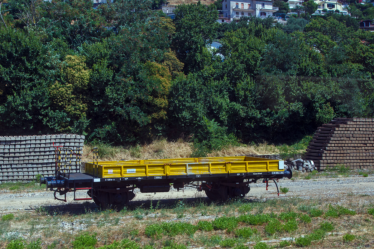 Der Italienischer zweiachsigem Gleiskraftwagenanhänger WD CRR MI 0098 L abgestellt am 19 Februar 2017 in Tirano, leider hier im Gegenlicht.