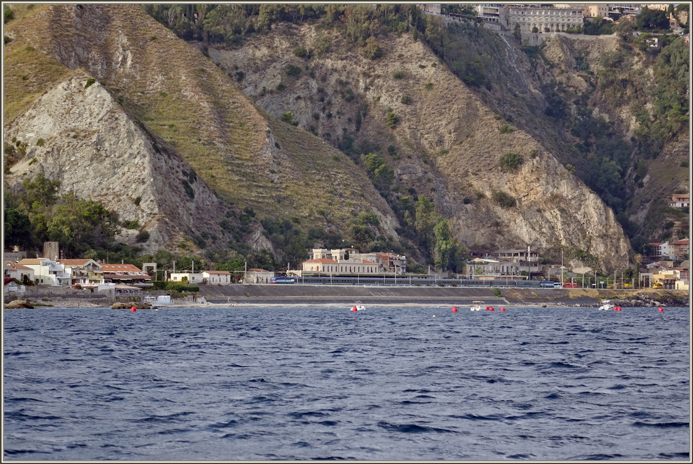 Ein Blick auf den Bahnhof Taormina Gardini vom Meer her: Dort steht während längerer Zeit ein recht lange Zug (ich hbe 10 Wagen gezählt) und zwei Lok, die ich nach Betrachten als E 464 einstufe. Aller Wahrscheinlichkeit handelt es sich um einen FS Treni Turistici Italiani (TTI)-Zug.