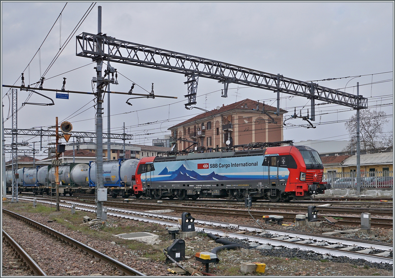 Die FS 652 075 hat mit ihrem Güterzug in Premosello-Chiovenda von der "Novara-Strecke" (die im Vordergrund zu sehen ist) auf die Milano-Strecke gewechselt und fährt nun Richtung Arona.