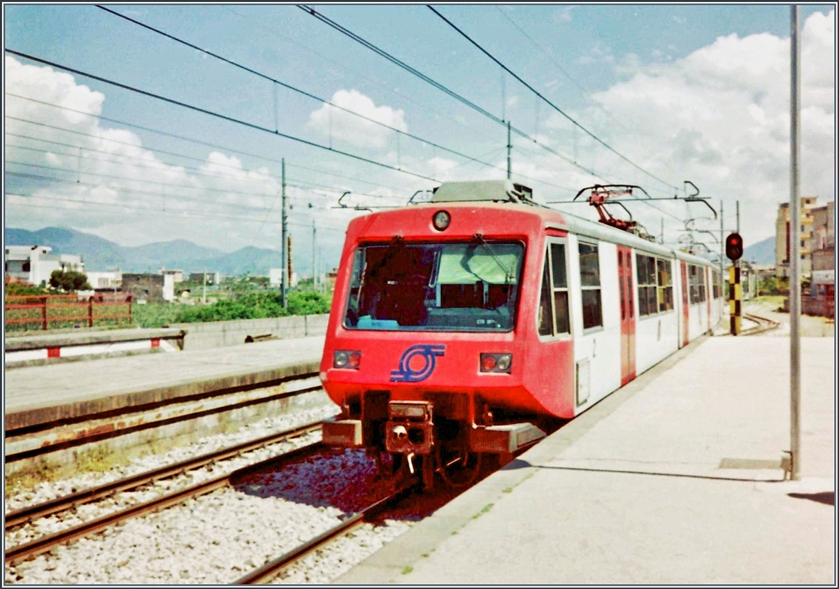 Zwei gekuppelte dreiteilige EVA Elektrotriebzüge vom Typ T21 (elettrotreni SFSM ETR 086 - 118) am 15.07.2022 beim Halt im Bahnhof Pompei Scavi. Sie fahren die Verbindung Sorrent (Sorrento) / Neapel (Napoli). Eine einfache Fahrkart für diese ca. 50 km lange Verbindung kostet 3,80 Euro.