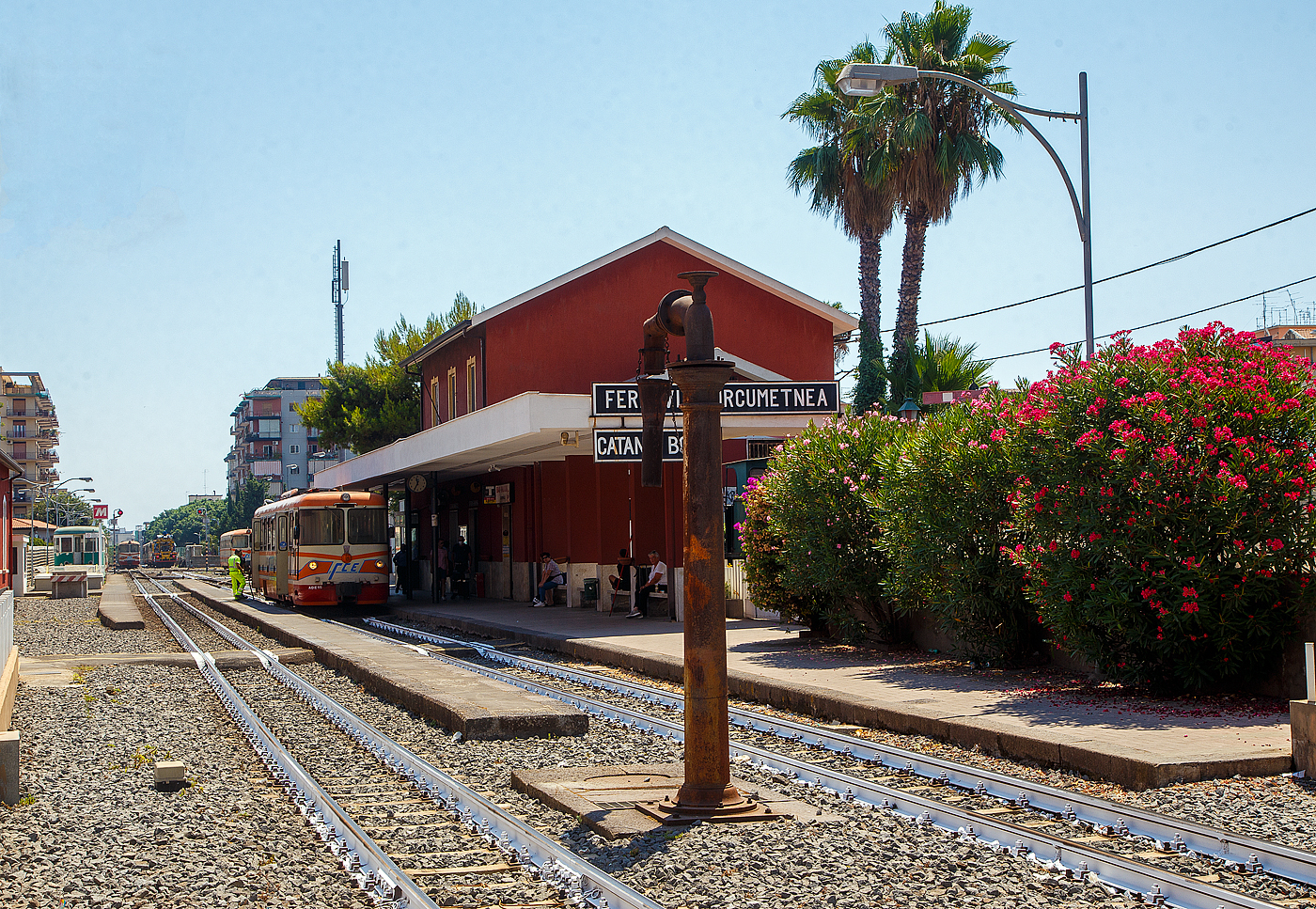 Der Triebwagen 1 (heute der einzige) der Ferrovia Principe Granarolo (Zahnradbahn) erreicht am 23 Juli 2022 die Talstation Principe.