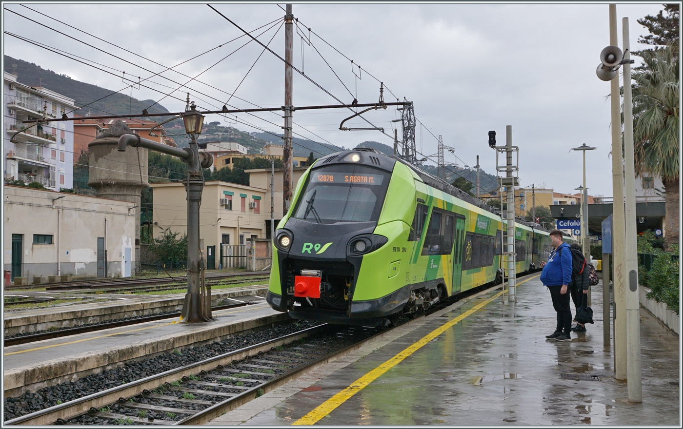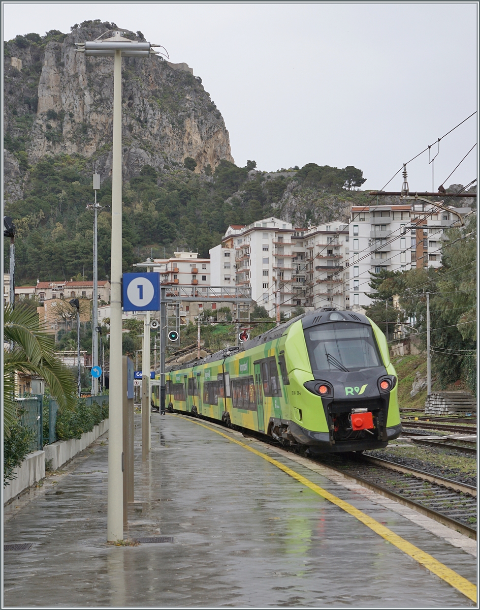 Ein weiterer FS Trenitalia "POP" ETR 104, der ETR 104 008, doch das Bild soll auch etwas vom Bahnhof von Palermo Centrale vermitteln, wie zum Beispiel die Bahnsteigdächer und als Kontrast die Palme am Bahnsteigende im Hintergrund.