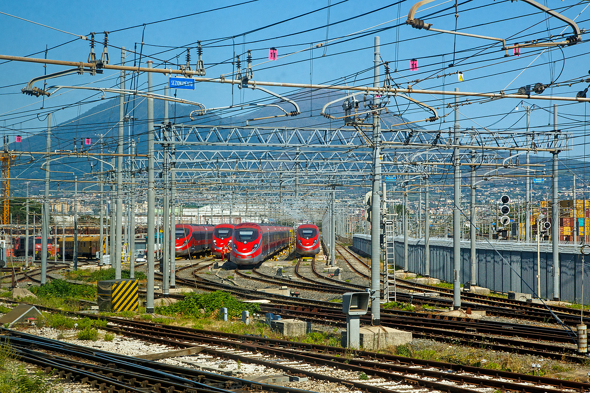 Der Trenitalia am 14.07.2022 aus dem Zug ins Depot in Neapel (Napoli) geschaut: Hier vor dem Trenitalia ETR 500 39 der Zephir Zweiwege-Rangierer (Elektro/Akku Rangierfahrzeug) vom Typ LOK 7.90E.