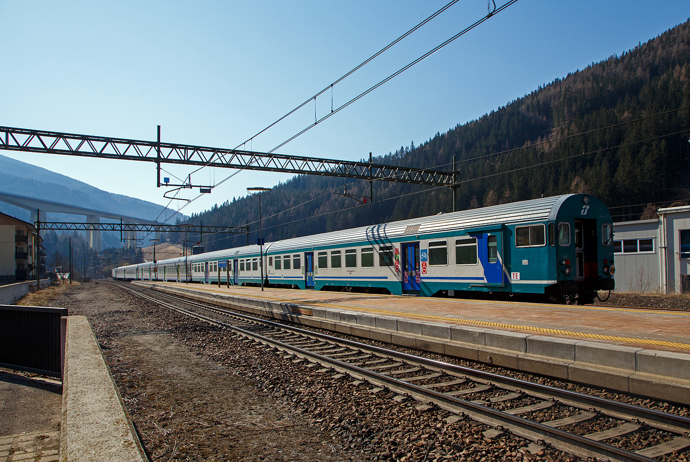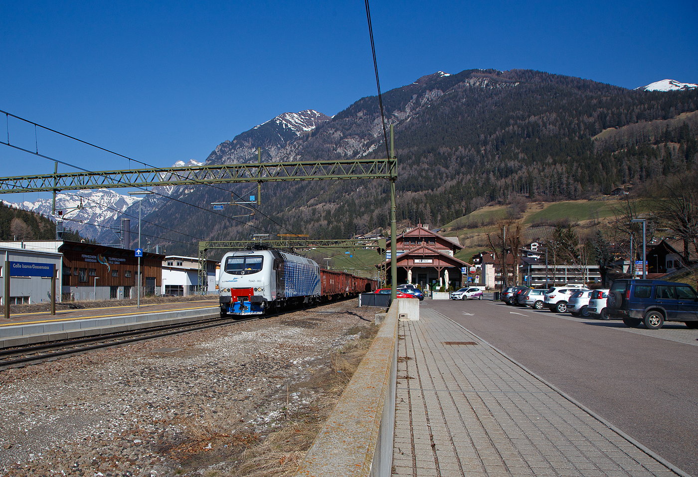 Die Trenitalia E 464.359 (91 83 2464 359-5 I-TI), eine Elektrolokomotive mit Mehrzweck-/Gepäckabteil vom Typ Bombardier TRAXX P160 DCP, schiebt am 28 März 2022 den Trenitalia Regional-Express (Verona Porta Nuova – Trento – Bozen – Brenner/ Brennero), vom Bahnhof Gossensaß/Colle Isarco weiter hinauf zum Brenner / Brennero.