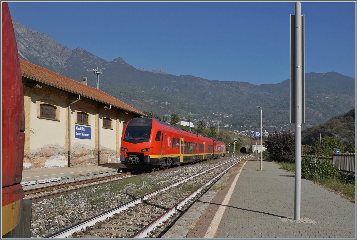 Während in Aosta auf Gleis 4 der FS Trenitaila ALn 501-MD 093 steht, wartet auf Gleis 1 der