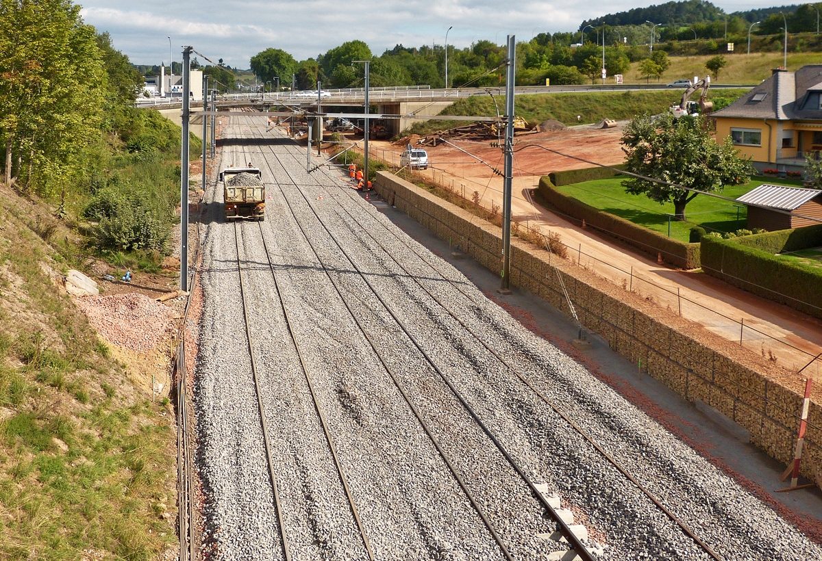 . Der Zweiwegebagger ATLAS 1404 MZ beim Stapeln fertig verschraubter Schienenstränge am 25.08.2015 in Schieren. Vielen Dank an der Baggerfahrer für das nette Beiseiteräumen eines Drahtgestells, welches die Sicht auf das Fahrzeug verdeckte. (Hans)