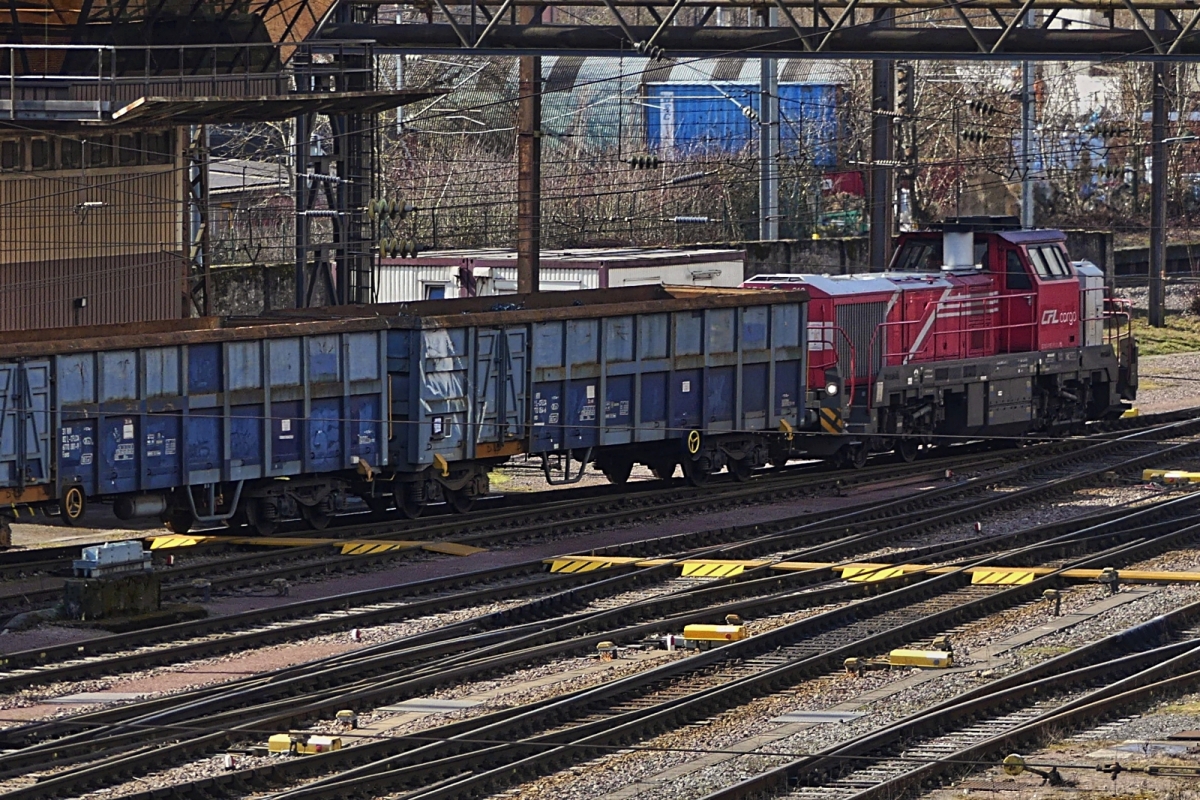 CFL Cargo 305, MAK G 850 BB, Fabriknr. 800158, BJ 1967, Bauart B’B‘-dh, schiebt einen langen mit Trägern beladenen Güterzug unter dem VELO-DUCKT hindurch in die Abstellung am Bahnhof Belval Université. 02.2025