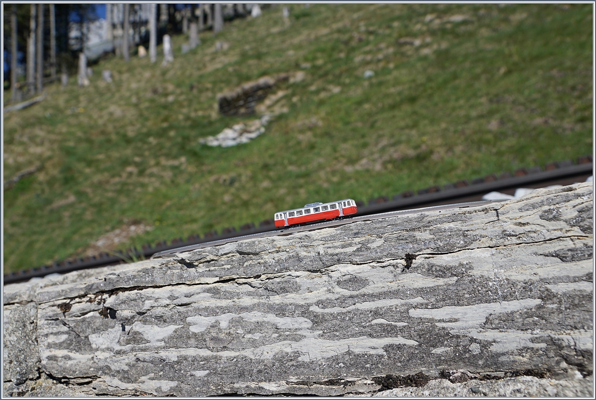 Der 1964 von der SLM projektierte im Original jeoch nie gebaute Brienz Rothorn Bahn BREB Bhm 2/4 beim "Felsenfenster" auf meinem Mini BRB Diorama.