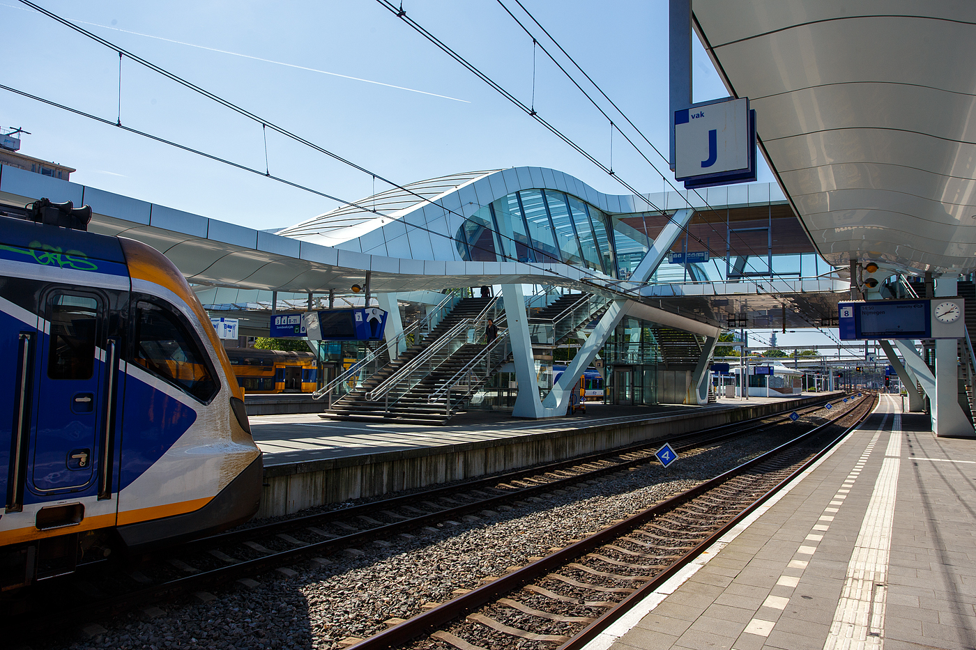 Transfer zu NS bzw. umgekehrt zu Arriva/Breng (Overstappen naar NS of vice versa naar Arriva/Breng) am Bahnsteig 6/7 im Bahnhof Arnhem Centraal (Arnheim Hbf) am 29 April 2025.