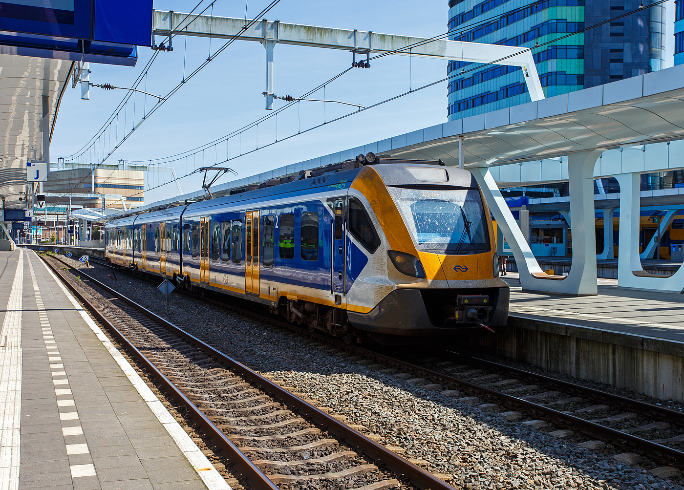 Der NS dreiteilige SNG 2327 (Sprinter Nieuwe Generatie), ein CAF Civity Triebzug steht am 29 April 2025 abfahrtbereit im Bahnhof Arnhem Centraal (Arnheim Hbf). Die Sprinter Nieuwe Generatie (SNG) sind elektrische Triebwagen der NS - Nederlandse Spoorwegen N.V. (Niederländische Eisenbahnen AG). Die elektrischen niederflurigen Triebzüge werden vom spanischen/baskischen Unternehmen CAF (Construcciones y Auxiliar de Ferrocarriles) in Beasain (E) seit 2017 hergestellt. Sie gehören zur CAF Civity-Familie. Bei der NS sind dreiteilige Sprinter-Triebzüge (Serie 2300/3000) und vierteilige Sprinter-Triebzüge (Serie 2700) im Regionalverkehr im Einsatz. Im Jahre 2014 gaben die Nederlandse Spoorwegen beim spanischen Hersteller CAF die Lieferung von 118 Zügen des Typs Civity in Auftrag. Die Bestellung umfasst eine Kapazität von 20.000 Sitzplätzen und soll für Sprinter-Züge im Regionalverkehr verwendet werden. Der erste Zug wurde auf dem Gelände von CAF in Beasain getestet. Im März 2017 fanden weitere Probefahrten auf dem Eisenbahnversuchsring Velim in Tschechien statt. Hierbei legte der Zug bereits 40.000 Kilometer zurück. Anschließend wurde seine Beständigkeit bei winterlichen Verhältnissen in einer Klimakammer in Wien geprüft. Am 14. September 2017 wurde der erste Zug in die Niederlande überführt und im Folgemonat in der Werkstatt der Nederlandse Spoorwegen in Amsterdam-West offiziell vorgestellt. Die übrigen Fahrzeuge wurden im Laufe des Jahres 2018 per Schiff ins Hafengebiet von Rotterdam verfrachtet und daraufhin von Lastkraftwagen zur Werkstatt Zaanstraat in Amsterdam-West transportiert. Im August desselben Jahres erhielten die Züge ihre Zulassung für den Einsatz im Personenverkehr. Somit konnten die Nederlandse Spoorwegen Testfahrten zwischen Haarlem und Alkmaar, Amersfoort und Apeldoorn sowie Arnhem und Zwolle durchführen. Mit Beginn des neuen Jahresfahrplans vom 9. Dezember 2018 begann der offizielle Einsatz der Sprinter Nieuwe Generatie. Noch im selben Monat machten die Nederlandse Spoorwegen die Bestellung von 88 weiteren Zügen bekannt. Der Sprinter Nieuwe Generatie der NS war der erste Großauftrag für Civity-Züge der CAF. Allgemeiner Aufbau: Die Züge bestehen aus drei oder vier Wagenteilen, die Endwagenteile ruhen jeweils auf einem normalen Trieb-Drehgestell und einem Jakobsdrehgestell als Laufdrehgestell, so ist die Achsfolge Bo’(2’)(2’)Bo’. So ruht das mittlere Wagenteil auf zwei Jakobsdrehgestellen. Bei den vierteiligen Zügen kommen zwei Jakobsdrehgestelle hinzu und das mittlere Jakobsdrehgestell ist dann zudem als Triebdrehgestell ausgeführt, so ist die Achsfolge Bo’(2’)(Bo’)(2’)Bo’. Durch Jakobsdrehgestelle erhalten die Züge breite Übergänge, wie sie auch bei U-Bahnen und Straßenbahnen üblich sind. Dies sorgt für eine bessere Verteilung der Fahrgäste im Zug und ein höheres Sicherheitsgefühl der Fahrgäste durch die verbesserte Übersicht im Zug. Der Boden befindet sich auf gleicher Höhe mit den Bahnsteig-Plattformen, wodurch der Zugang in den Zug erleichtert wird. Die Türen sind mit ausziehbaren Stufen ausgestattet, sodass Rollstuhlfahrer ohne großen Kraftaufwand einsteigen können. Die Züge werden mit ATB-EG, dem traditionellen Sicherungssystem des Hauptschienennetzes, und dem europäischen Sicherungssystem ETCS ausgestattet, sodass die Züge auch in Zukunft auf den niederländischen Schienen verkehren können. Das elektrische System für diese Züge wird von der Mitsubishi Electric Corporation geliefert. Interieur / Innemraum: Die Züge sind mit rollstuhlgerechten Toiletten ausgestattet. Diese fehlten längere Zeit im Sprinter Lighttrain, was zu öffentlichen Protesten und einem Antrag im Repräsentantenhaus führte. Jeder Zug verfügt außerdem über spezielle Bereiche für Rollstühle und Falträder. Die Züge sind mit Steckdosen und USB-Anschlüssen für die erste und zweite Klasse ausgestattet. Durch den Einsatz von Sicherungen wird sichergestellt, dass die Fahrgäste nicht zu viel Strom verbrauchen und der Zug weiterhin ordnungsgemäß funktioniert. Außenfarbwechsel: Anfangs hatten die SNG-Züge, wie auch andere Triebzüge, eine dunkelblaue Front. Während diese Färbung den europäischen Standards entsprach, machte die Kombination aus der dunklen Farbe und dem großen Fenster es schwierig, den Zug von Bahnübergängen aus zu sehen. Der Mangel an Sichtbarkeit war die Hauptursache für eine Kollision zwischen einem Traktor und einem SNG an einem unbesicherten Bahnübergang im Mai 2020, bei dem der Lokführer getötet wurde. Die NS beschloss, die Farbe der Fronten von Triebzügen in Gelb zu ändern, von denen der erste im Mai 2021 seinen Dienst aufnahm. Die NS musste so die 150 bereits gelieferten SNG-Triebzüge neu lackieren, während die neuen Züge von CAF mit der „gelben“ Front geliefert wurden. Der Übergang zur neuen Farbe war bis August 2022 nahezu abgeschlossen. Eine ähnliche Änderung wurde 2023 an den FLIRT-Züge vorgenommen. TECHNISCHE DATEN dreiteilige SNG, vierteilige SNG in Klammern: Hersteller: Construcciones y Auxiliar de Ferrocarriles (CAF), Beasain (E) Herstellertype: CAF Civity Baujahre: 2017 bis 2023 Nummerierung: 2301-2368, 3001-3050 / (2701-2788) Anzahl: 206, davon 118 dreiteilige und 88 vierteilige SNG Spurweite: 1.435 mm (Normalspur) Achsfolge: Bo′2′2′Bo′ / (Bo′2′Bo′2′Bo′) Länge über Kupplung: 59.560 mm / (75.760 mm) Breite: 2.880 mm Höhe: 4.300 mm Treib- und Laufraddurchmesser: 850 mm (neu) / 780 mm (abgenutzt) Traktionssystem: Mitsubishi Electric MAP-243-15VD288 (SiC- IGBT VVVF) Traktionswechselrichter: 2× Mitsubishi MAP-243-15VD288 Fahrmotoren: 4 (bzw. 6) Stück Ssynchron-Drehstrommotoren vom Typ Mitsubishi MB-5165-A mit einer Leistung von je 240 kW (bei Vierteiler 6 Motore) Getriebe: CAF MIIRA AHHD-430-4.822-1 (Nennleistung 220 kW / 2.192 Nm) Übersetzungsverhältnis: 1 : 4,822 Traktionsnennleistung: 1.600 kW / (2.400 kW) Höchstgeschwindigkeit: 160 km/h, Planmäßi