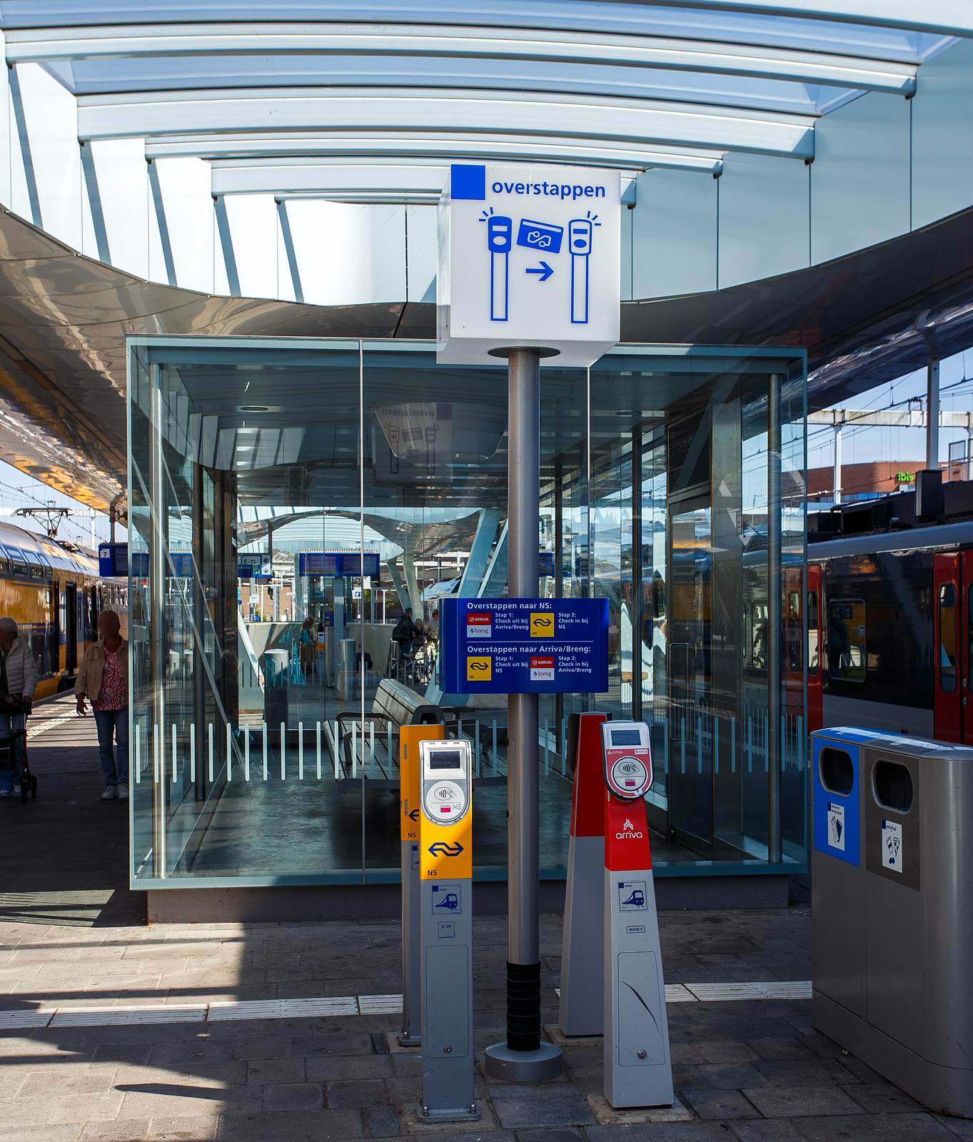 Hier muss man mit seiner Debitkarte, OV-Chipkarte oder Ticket ein- und auschecken, wenn man zwischen den Zügen der Betreiber NS und der Arriva/Breng wechselt.