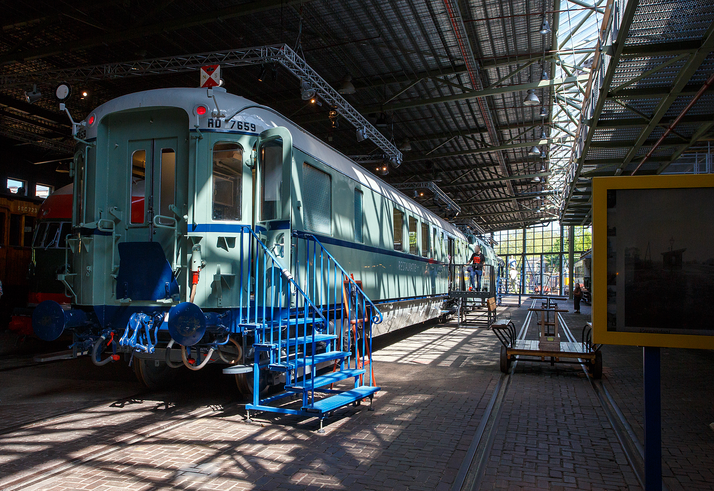 Der kombinierte Speise- und Gepäckwagen vom Typ Plan D – NS RD 7659 am 29 April 2025 im Het Spoorwegmuseum (bis 2005 NSM - Nederlands Spoorwegmuseum / Niederländischen Eisenbahnmuseum) in Utrecht im ehemaligen Bahnhof Maliebaan.