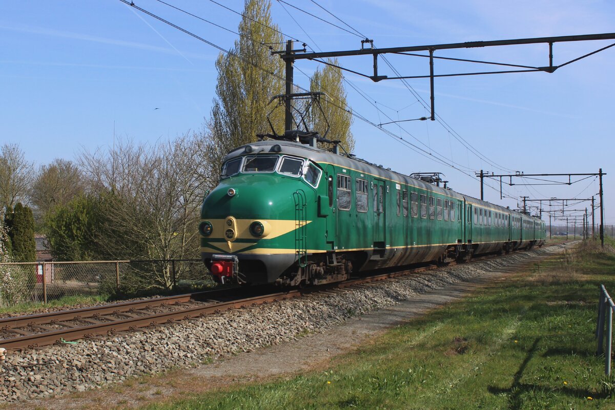Historischer Triebzug 766 durchfahrt Niftrik am 11 April 2025 auf ein Konditionsfahrt von Amersfoort über Deventer, Nijmegen und Eindhoven nach Maastricht.