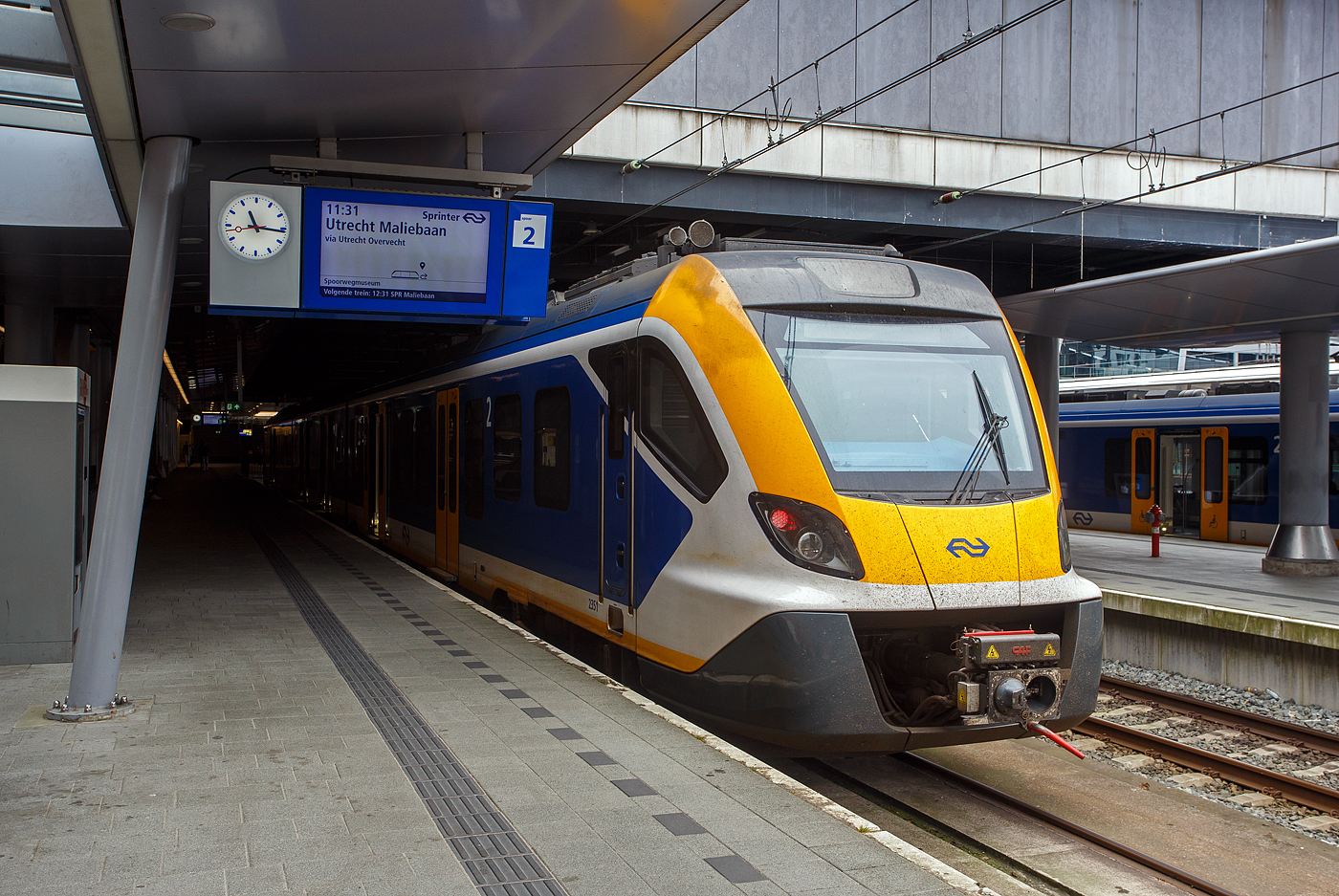 Der dreiteilige NS SNG 2351 (Sprinter Nieuwe Generatie), ein CAF Civity Triebzug, steht am 24 Juni 2025 in Utrecht Centraal auf Gleis 2 (Stumpfgleis), als Sprinter RE 28300 (Pendelzug), zur Abfahrt nach Utrecht Maliebaan bzw. ins Het Spoorwegmuseum bereit.