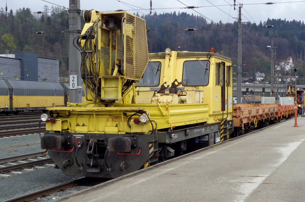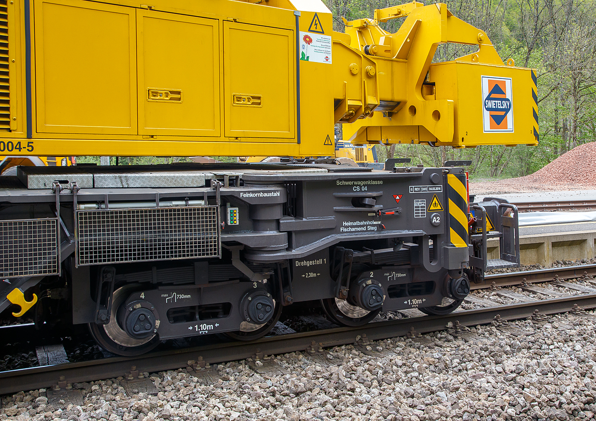 Der 150 t KIROW Gleis- und Weichenbaukran KRC 1200 (ein Kirow MULTI TASKER KRC 1200) A-RTS 99 81 9119 004-5, ex SKL X 980 009-5, der Firma Swietelsky (eigestellt durch die Tochtergesellschaft RTS Rail Transport Service GmbH) ist am 14.05.2016 im Bahnhofs von Kautenbach (Luxemburg) im Einsatz. Der Kran hat die 50t-Traverse (Eigengewicht 5.600 kg) im Haken.