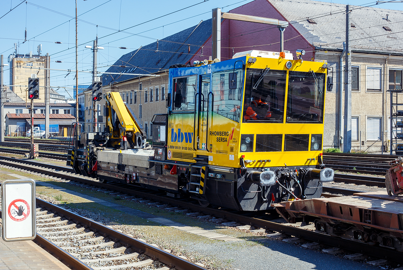 Der Oberbauwagen / Gleiskraftwagen ÖBB X 630.558 (99 81 9150 558-0A-ÖBB) ein GKW Robel Bamowag 54.22 der ÖBB-Infrastruktur steht am 04 April 2025 in Wels. Aufnahme aus einem Zug.