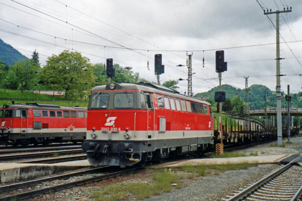 ÖBB 2043 010 schiebt ein Güterzug aus Schwarzach-St.Veit nach am 29 Mai 2004.
