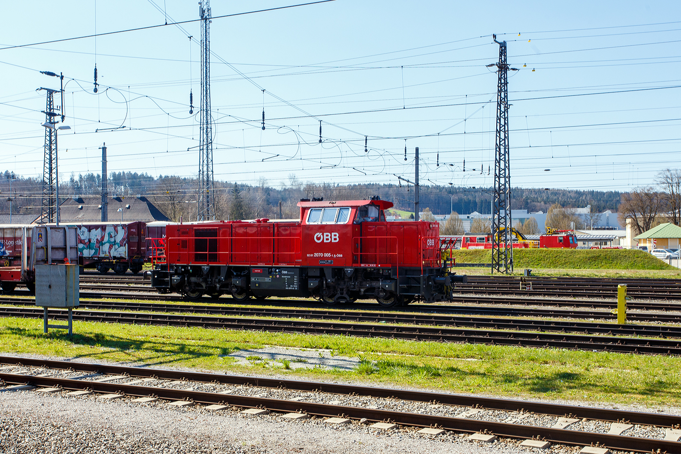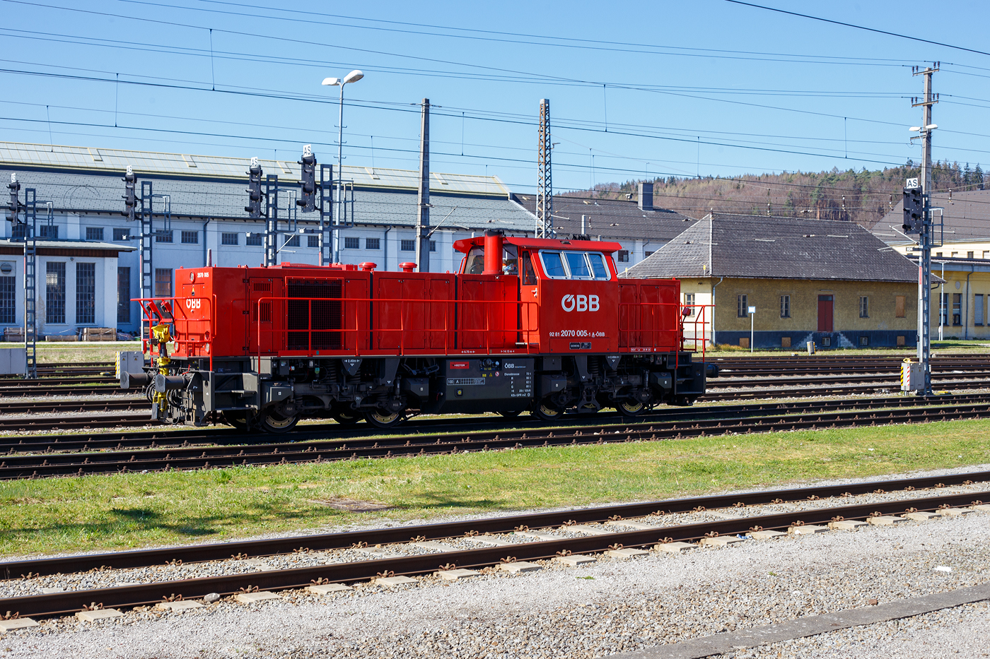 Die ÖBB 2070 005 (92 81 2070 005-1 A-ÖBB), eine „Hector“ bzw. Vossloh/MaK G 800 BB der ÖBB-Produktion Gesellschaft mbH, rangiert am 03 April 2025 beim Bahnhof Attnang-Puchheim. Die „Hector“ wurde 2001, im Auftrag von Siemens (daher auch das 2. linke Fabrikschild) von der Vossloh Schienenfahrzeugtechnik GmbH in Kiel unter der Fabriknummer 1001052 gebaut und an die ÖBB als 2070 005-0 geliefert.