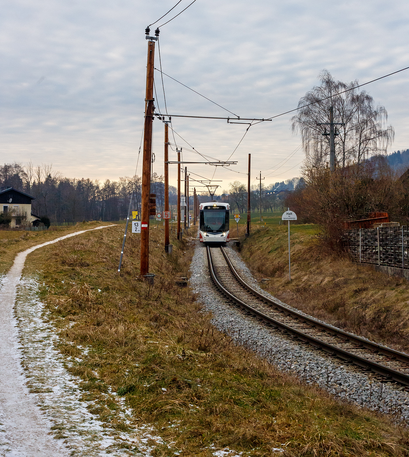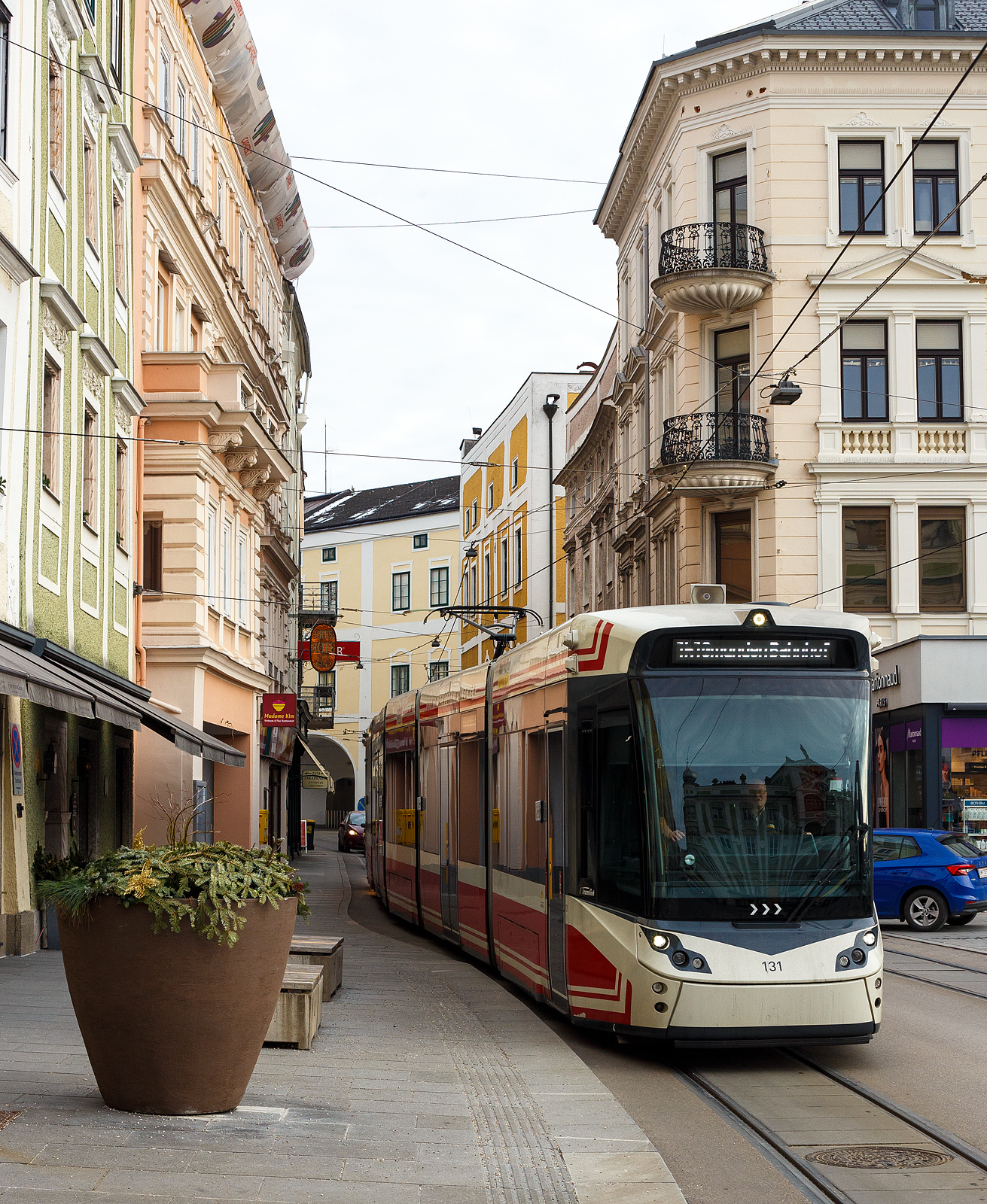 Innenraum eines fünfteiligen STADLER Zweirichtungs-Multigelenk-Stadtbahnwagen in Niederflur-Bauweise vom Typ Tramlink V3 der neuesten Generation (Tramlink 2.0). Hier der Meterspur-Straßenbahn-Triebwagen StH ET 127 der Stern & Hafferl Verkehrsgesellschaft m.b.H. am 14 Januar 2025 in Vorchdorf.