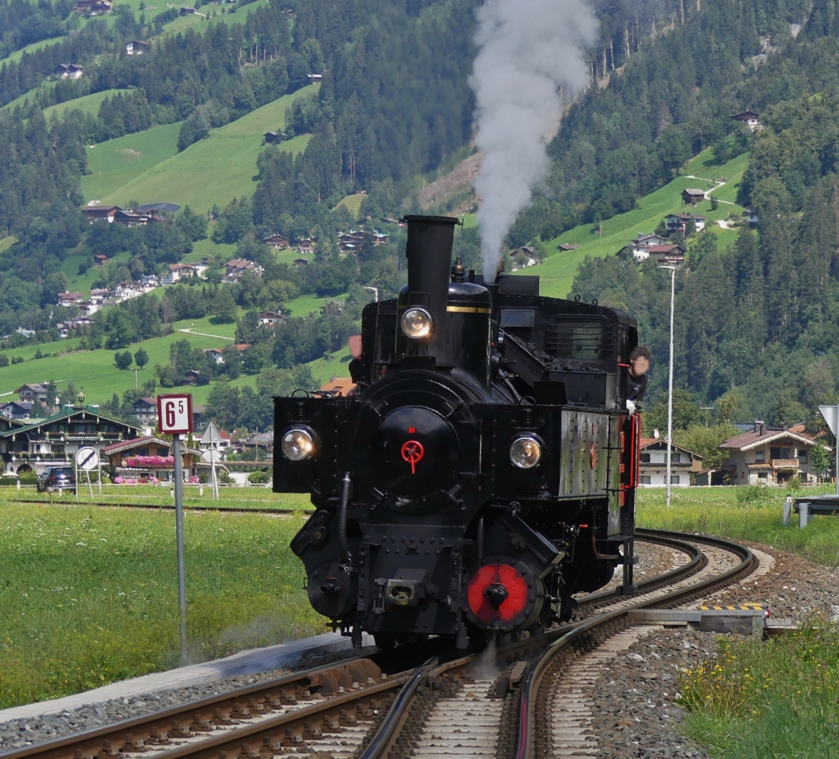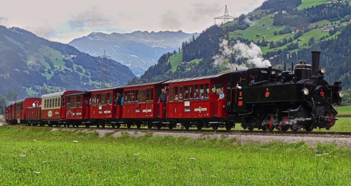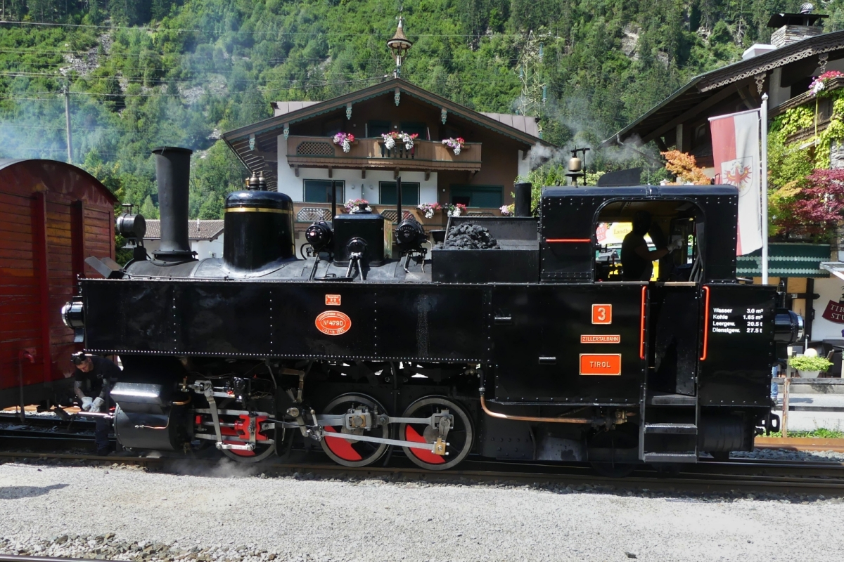 Steuerwagen VS 7, der Zillertalbahn, (seit 2010 im Betrieb), wird in Kürze den Zug nach Jenbach führen, der Zug wird von Lok D 16 geschoben. Die Züge verkehren im halb Stunden Takt. 19.08.2024