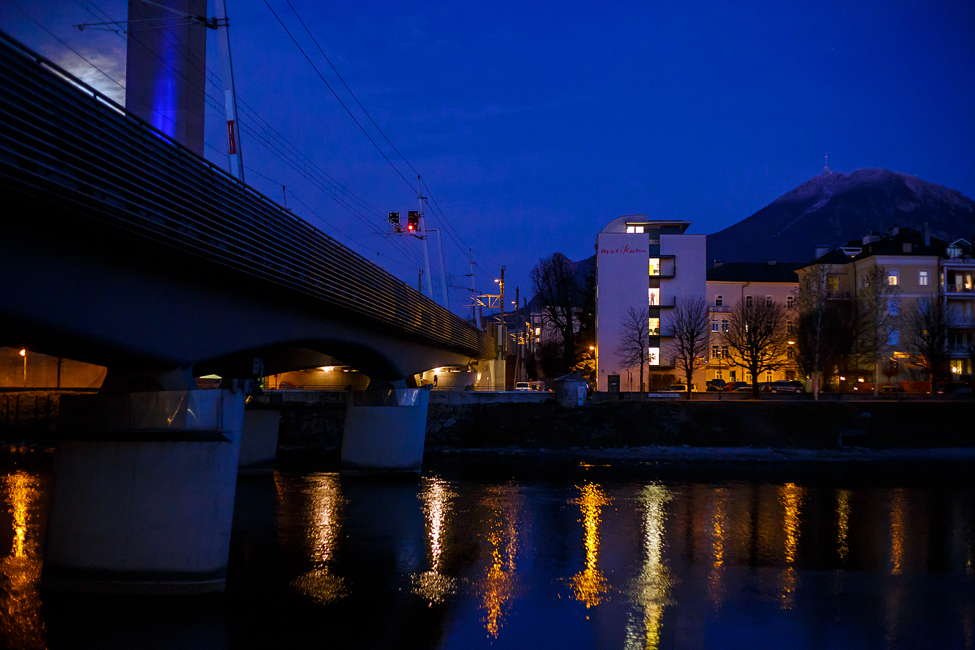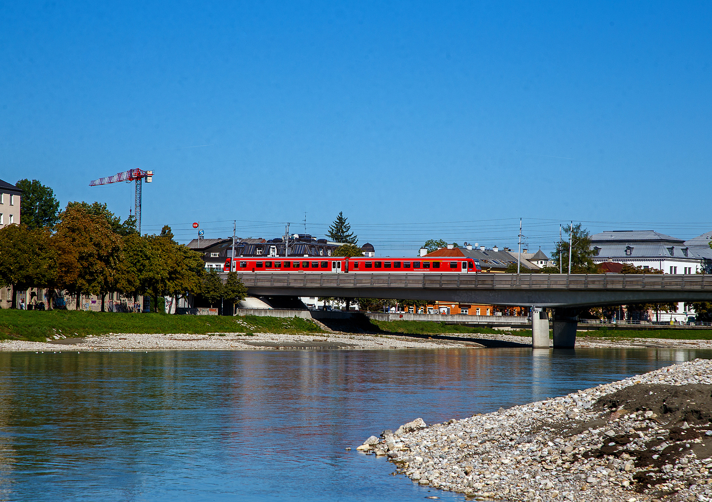Ein vierteiliger Elektrotriebzug der ÖBB Reihe 4024 vom Typ Bombardier TALENT (Talbots leichter Nahverkehrs-Triebwagen) vom Salzburger Verkehr überquert am 10.09.2022 in Salzburg die Salzach. Er fährt als S3 der S-Bahn Salzburg die Verbindung Bad Reichenhall – Freilassing – Salzburg – Schwarzach, und erreicht so nun bald den Hbf Salzburg.