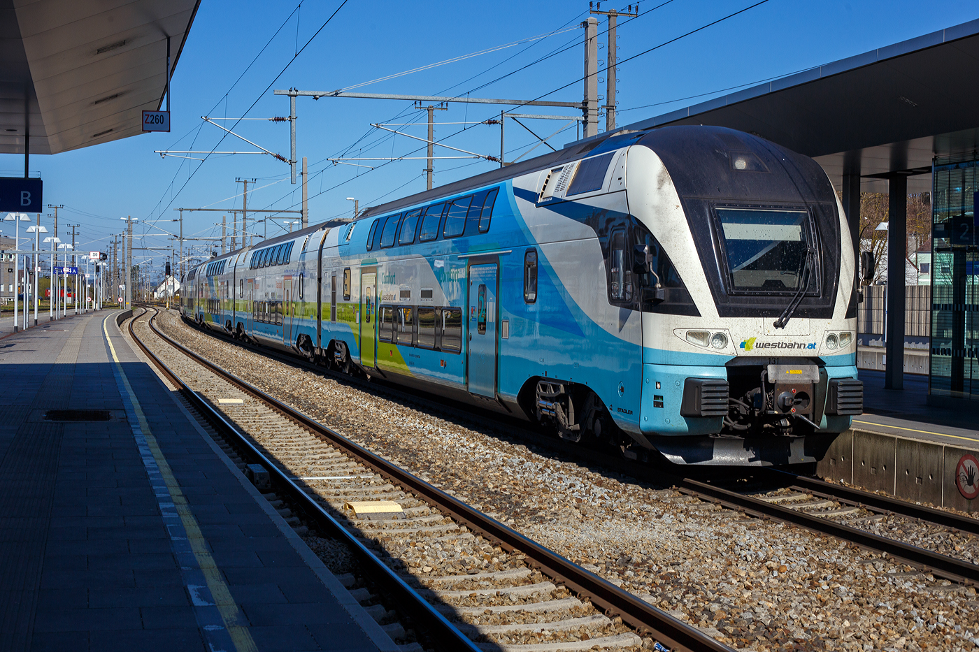 Der sechsteilige Stadler Kiss³ 4010 120 bis 4010 620 der WESTbahn fährt als west 907 (St. Johann im Pongau - Bischofshofen - Salzburg Hbf - Attnang-Puchheim - Linz Hbf- St. Pölten Hbf - Wien Westbahnhof) am 14 Januar 2025 vom Bahnhof Attnang-Puchheim weiter in Richtung Wien.