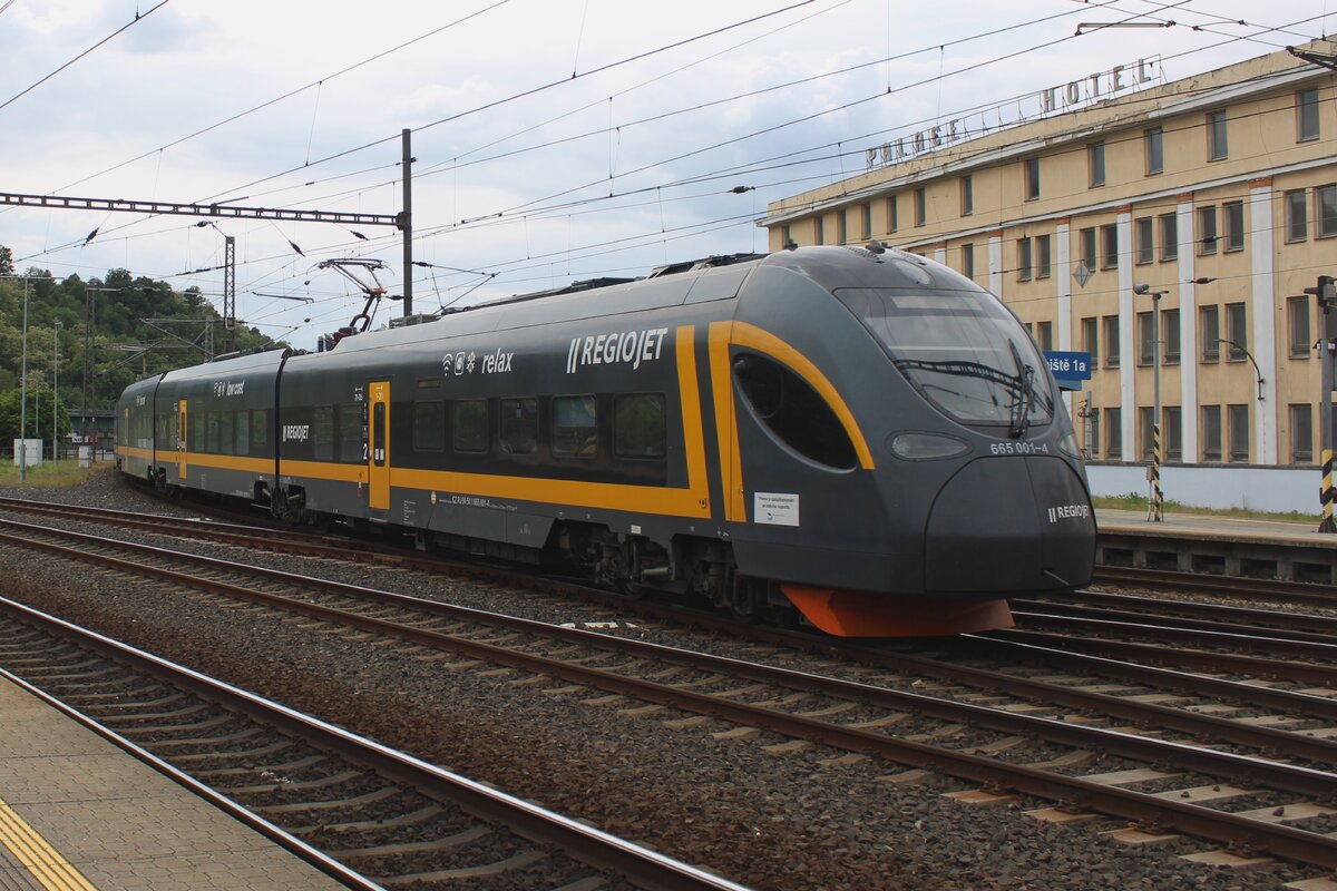 Regiojet 665 001 verlasst am 27 Mai 2025 Usti nad Labem als Rychlyk nach CHeb über Chomutov.