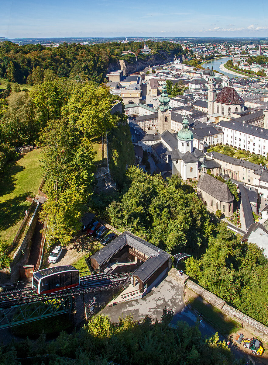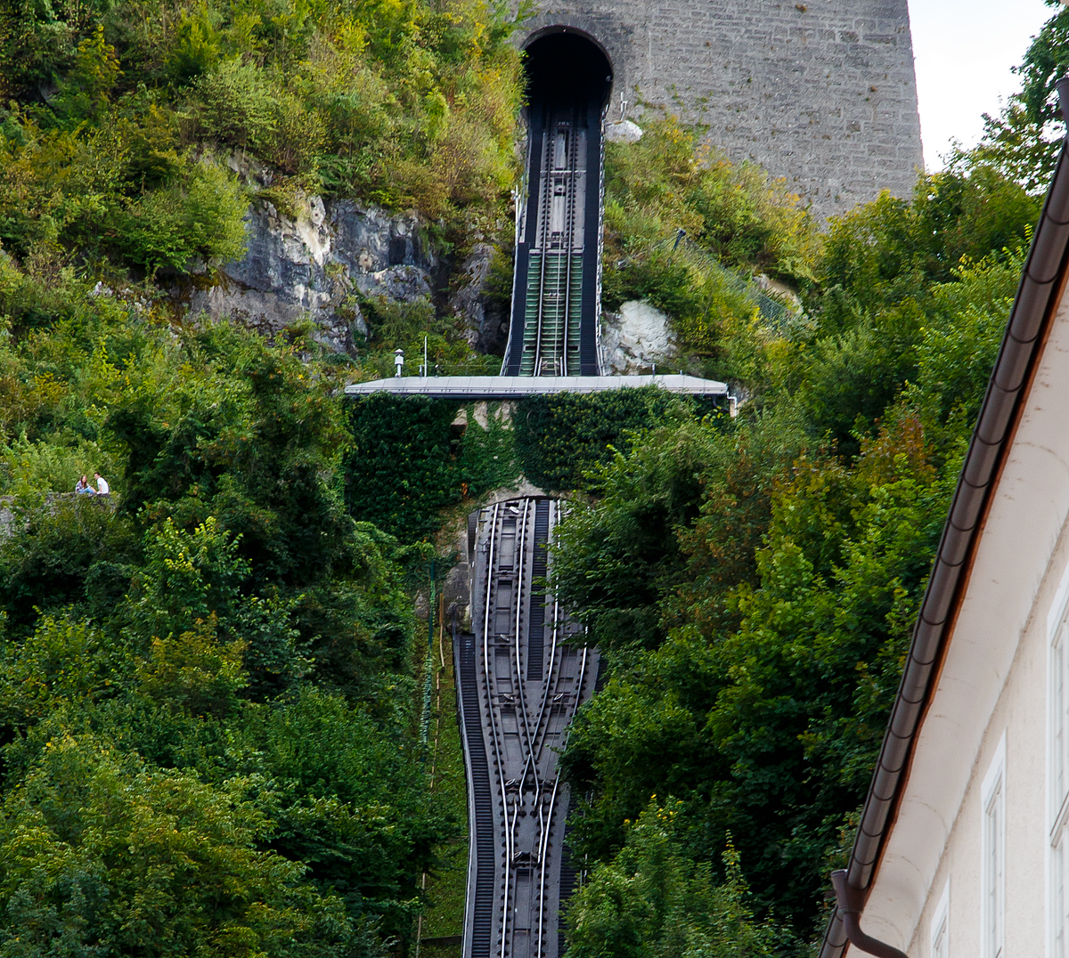 Wagen 2 FestungsBahn Salzburg auf Talfahrt oberhalb der Abtsche Ausweiche (Abtsche Weiche) bzw. der Mittelstation am 12.09.2022.