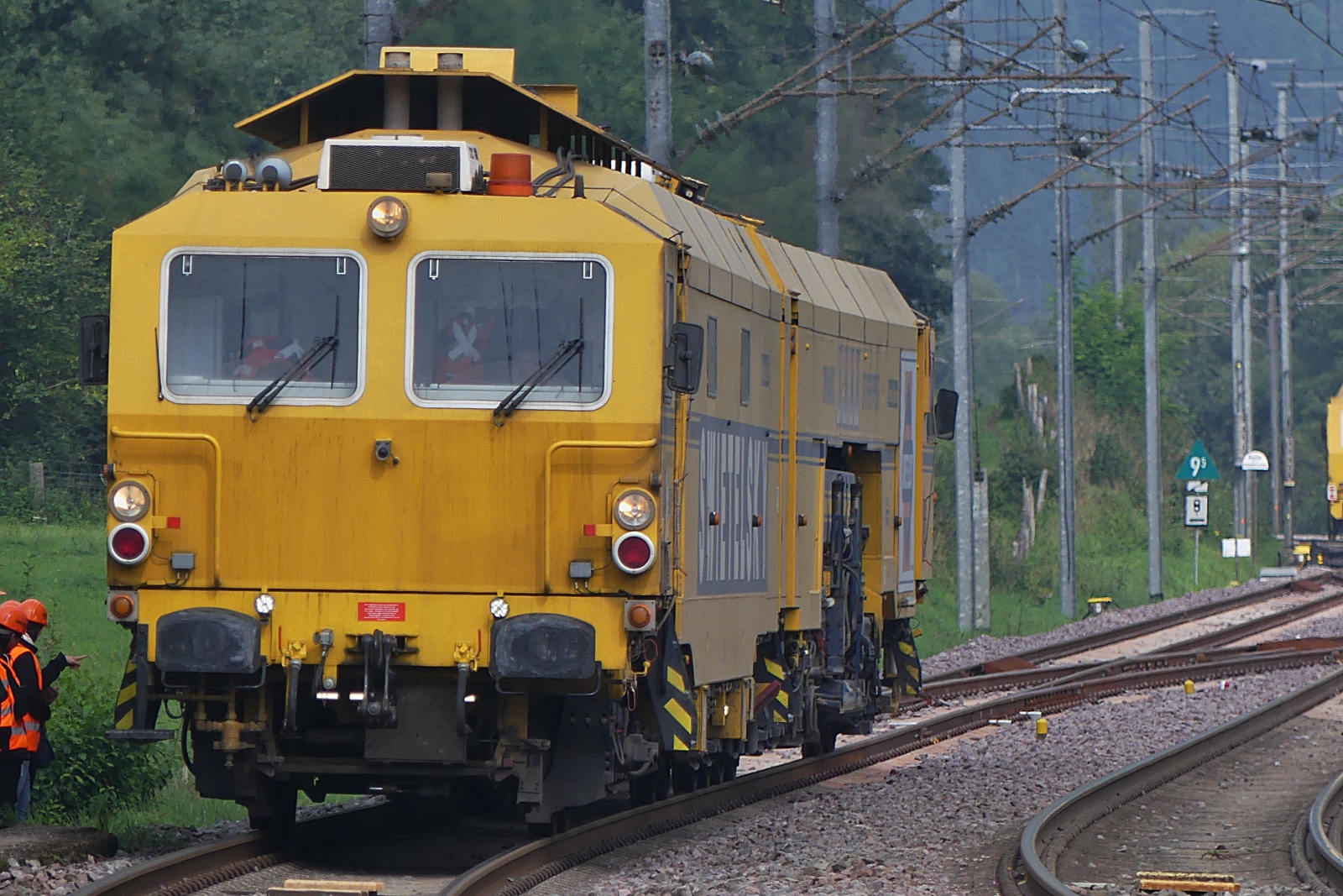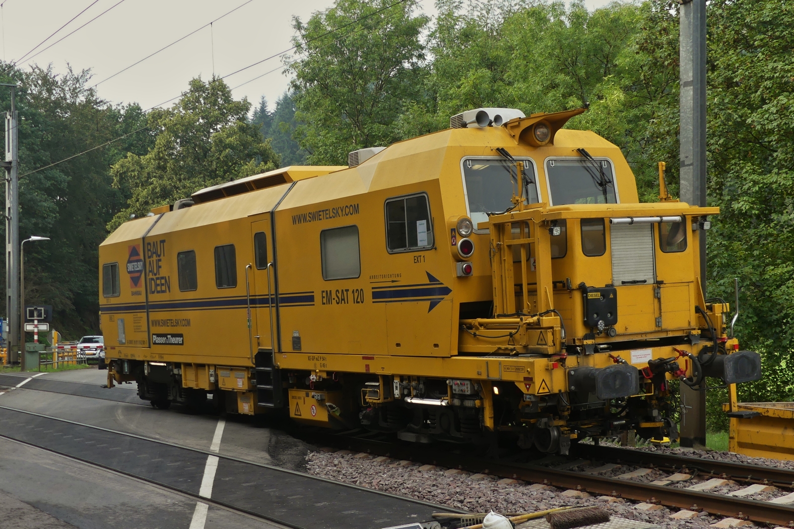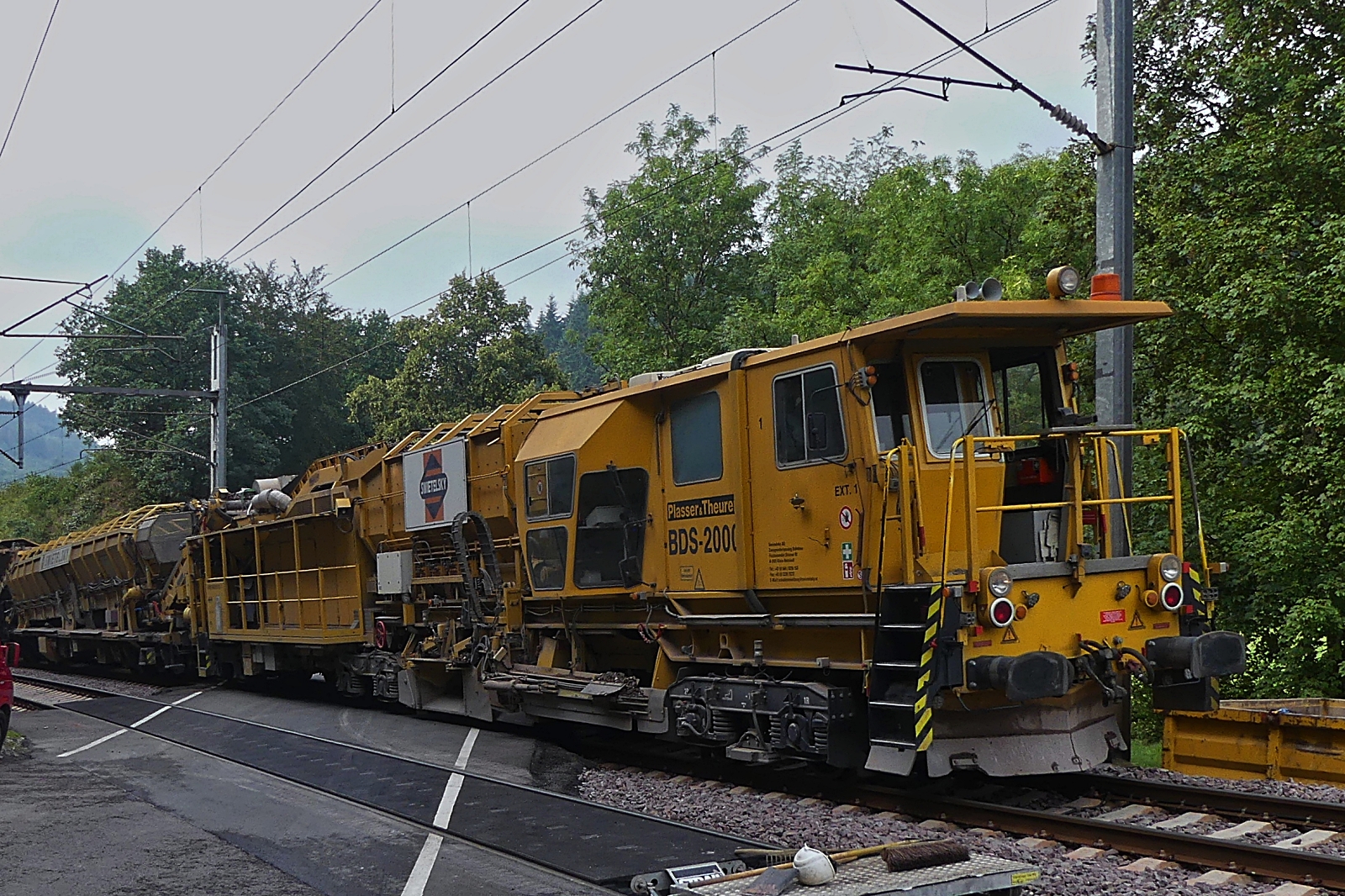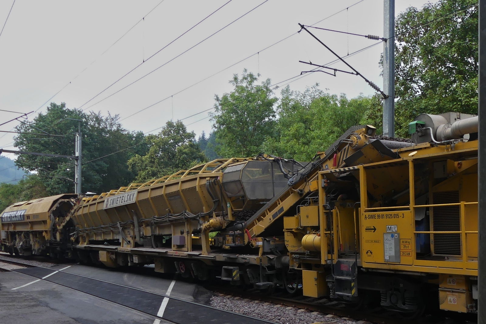 RTS Diesellok 2016 905 mit den Schottersammelwagen an der Entladestelle in der Nähe von Drauffelt. 25.08.2023