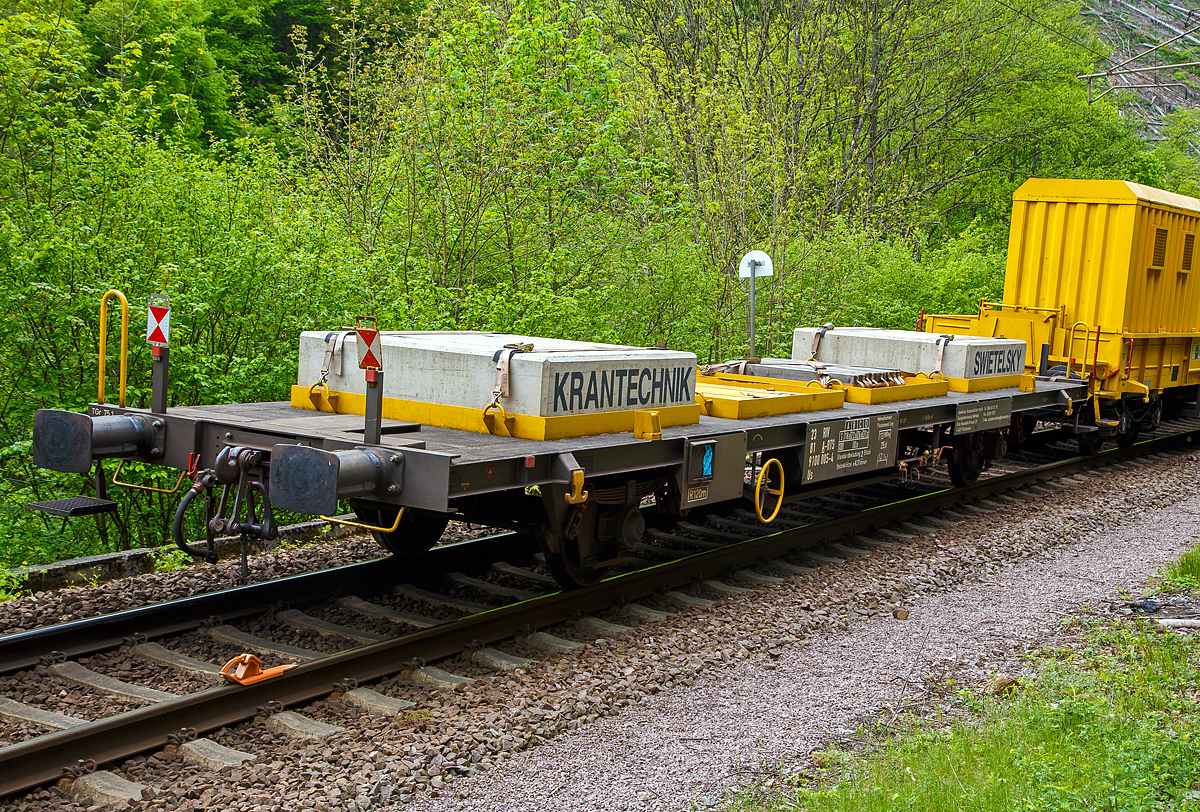Dahinter daran gekuppelt der zweiachsige Flachwagen 23 81 9100 005-4 A-RTS der Gattung Us, die Standartbeladung sind 2 Stück Betonklötze á 4,3 Tonnen (als zusätzliche Gegengewichte für den Kran KRC 1200).