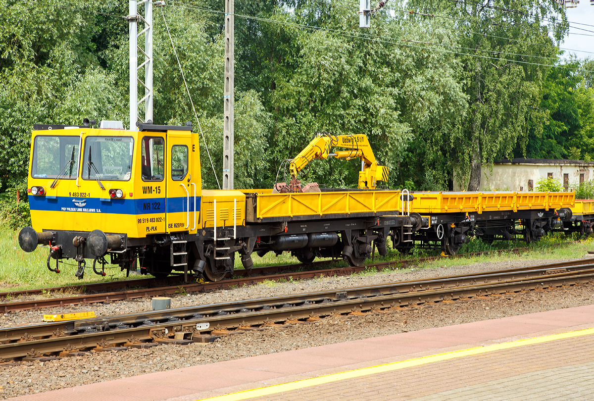 Das polnische modernisierte zweiteilige Fahrzeug für den Oberleitungsbau und Instandhaltung von Oberleitungen PS-00/B nr 05 (99 51 9 431 057-0 PL-PKPE) der PKP Energetyka fährt am 27 Juni 2017 durch den Bahnhof Rzepin (deutsch Reppen) in Richtung Osten.