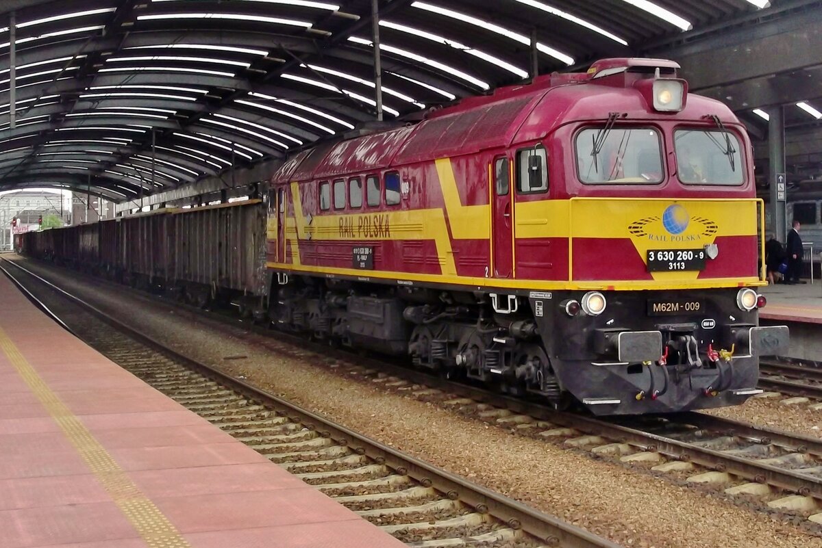 Am 28 Mai 2015 schleppt M62M-009 von Rail Polska ein Kohlezug durch Katowice Glowny.