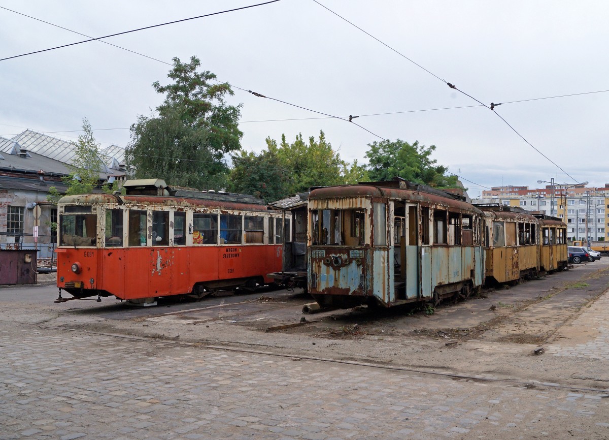 Die am 19. August 2014 in Breslau per Zufall entdeckten Strassenbahnen warten im Freien abgestellt auf die Aufarbeitung. Auf die Breslauer Strassenbahnfreunde wartet somit noch viel Arbeit.