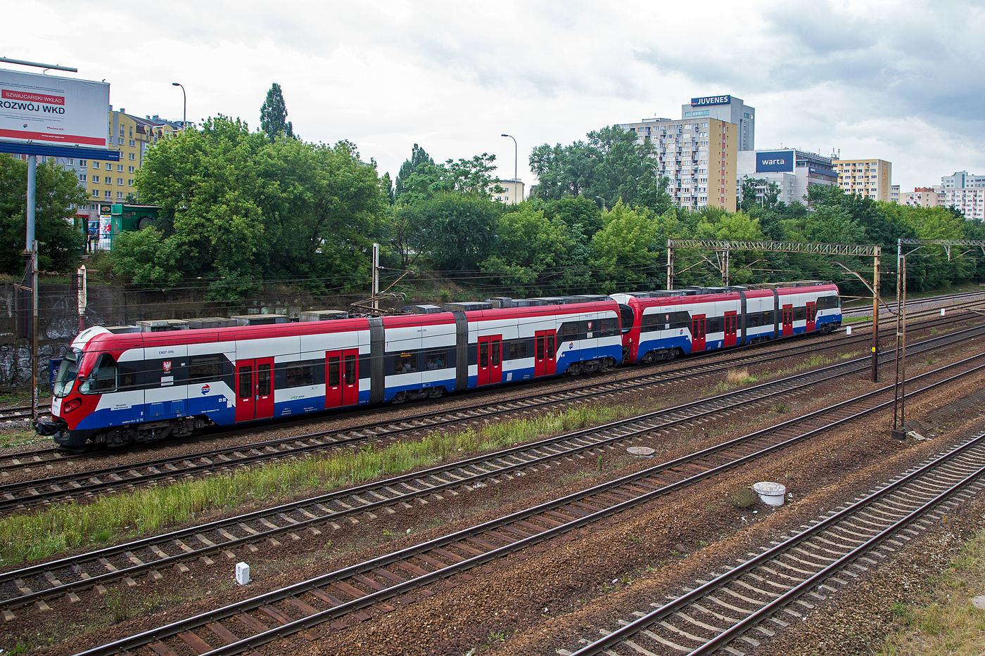 Privatbahnen in Polen: WKD S-Bahn mit EN 97-013a PESA anlässlich einer Kreuzung mit AKMWA 2150 009-0 in WARSZAWA OCHOTA am 14. August 2014.