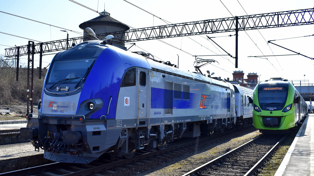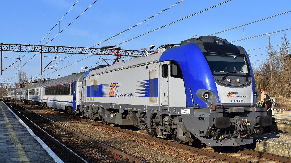 PKP Intercity spółka z o.o., Warszawa [PL] mit der geleasten Cargounit Vectron "5370 051-2/ 6193 057", Name: "MONIKA"[NVR-Nummer: 91 51 5370 051-2 PL-ID] mit dem neuen EC 135 Richtung Przemysl Glowny am 16.12.25 Einfahrt Bahnhof Ruhland.