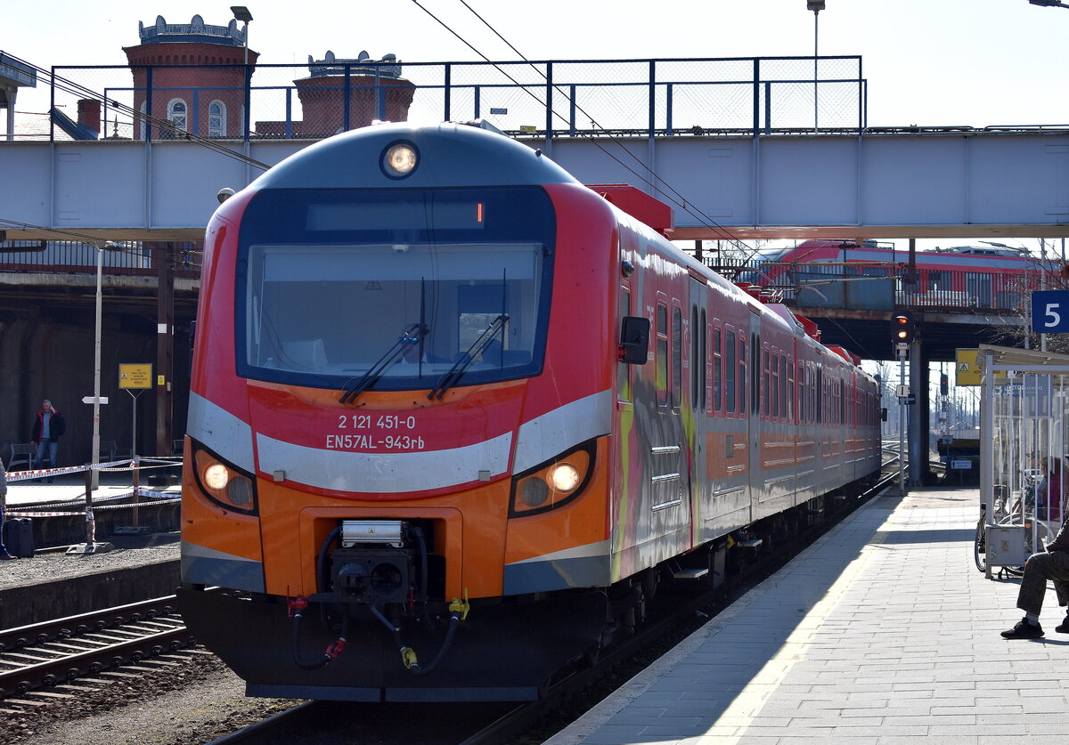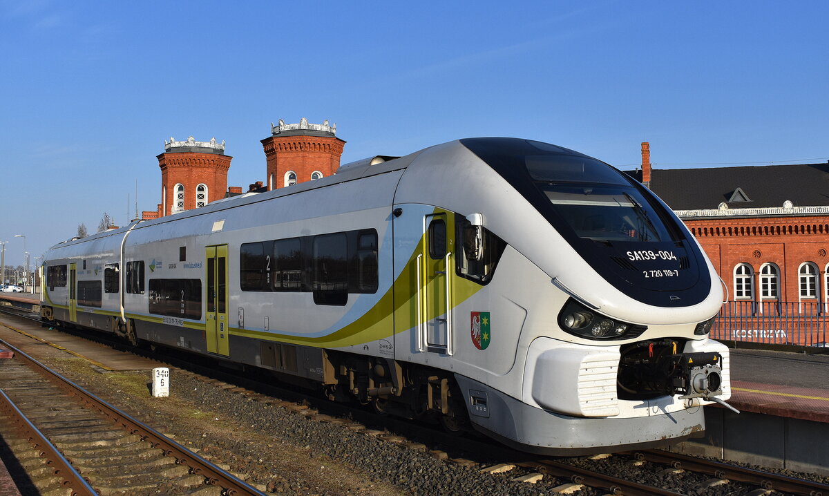 Polregio sp. z o.o. mit ihrem neuen Impuls E-Triebzug "31WEbb-024" (NVR: "94 51 1 141 954-9 PL-PREG......") am 18.03.26 in Bahnhof Kostrzyn nad Odrą.