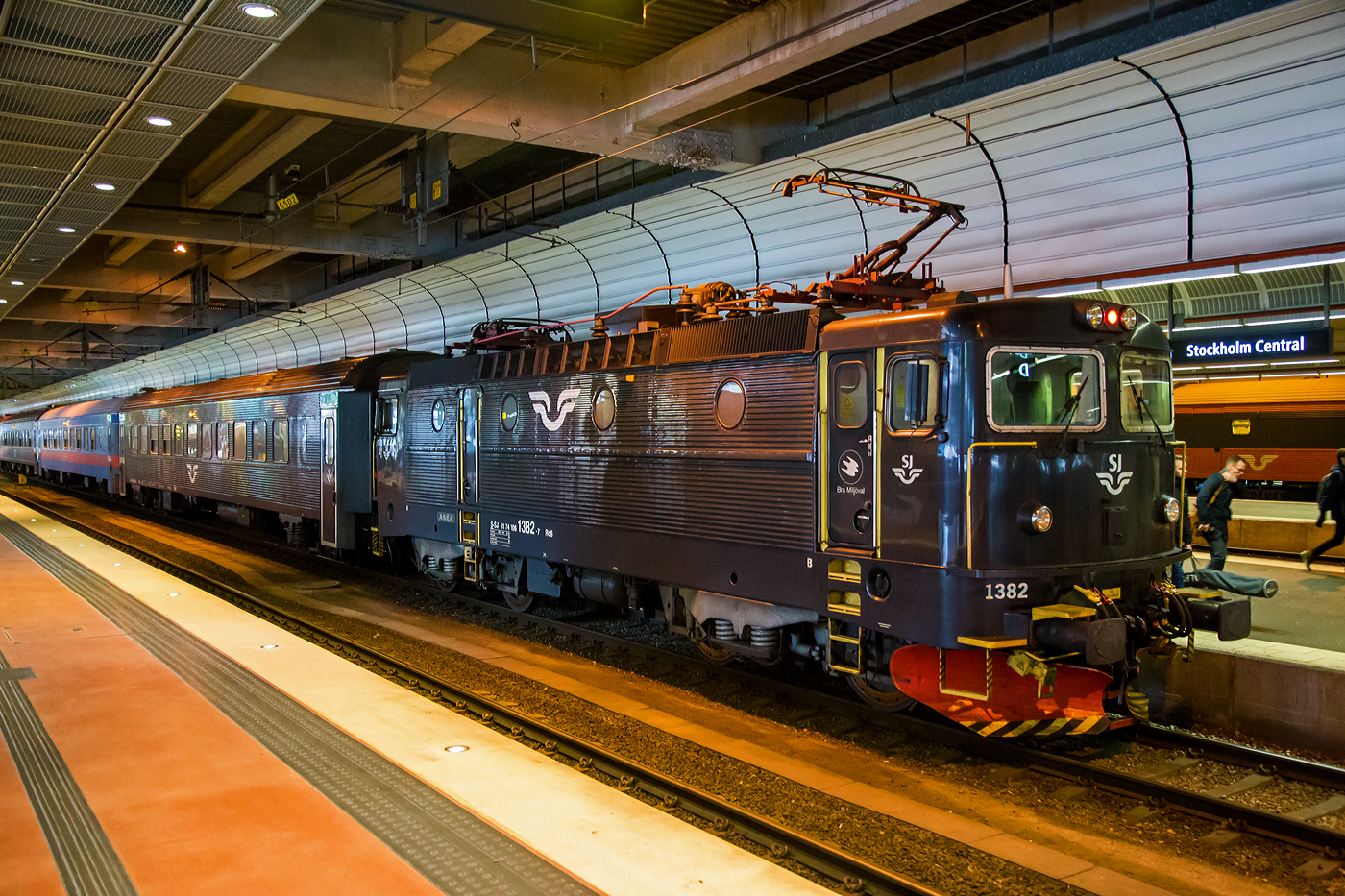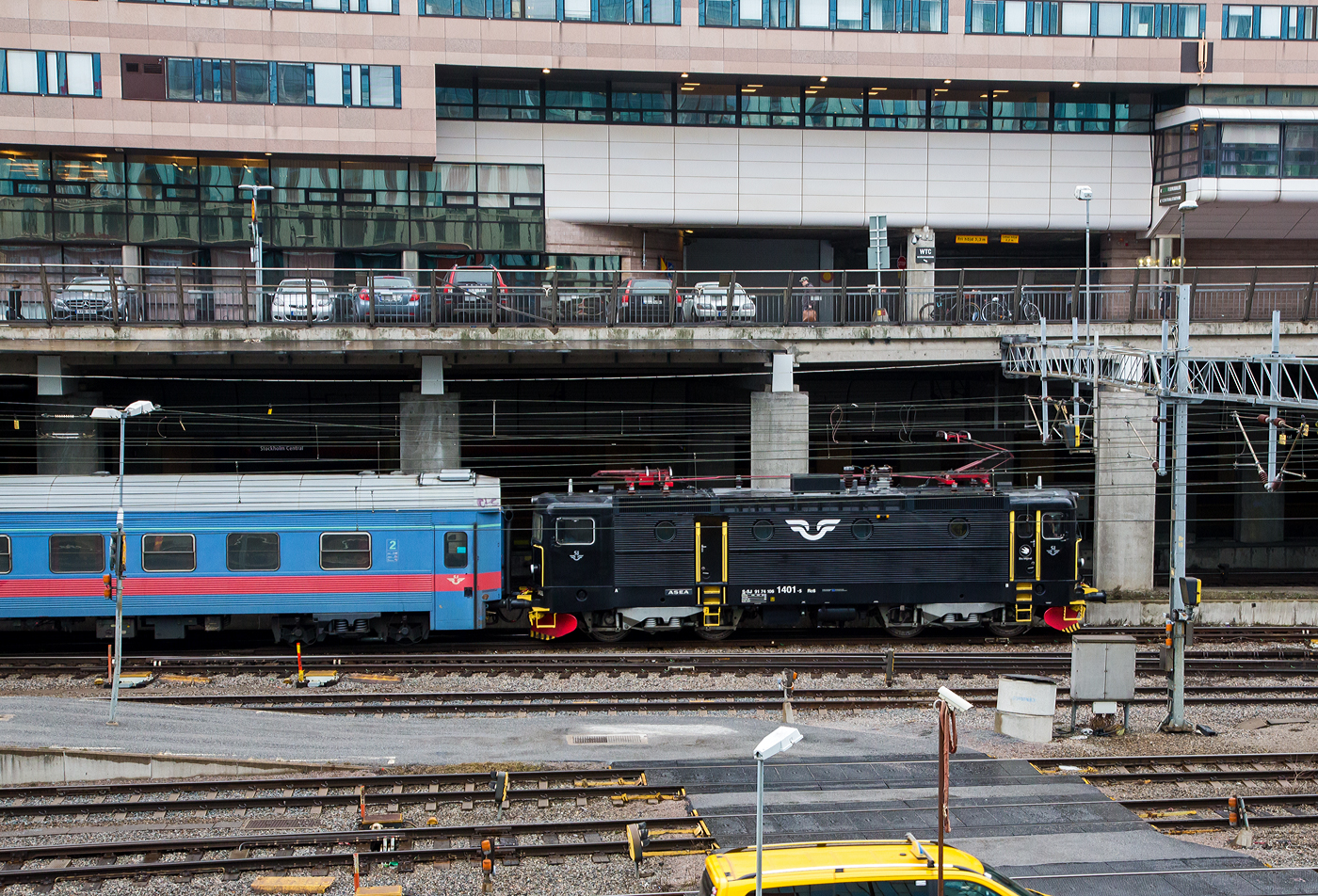 Die TÅGAB Rc3 1066 (91 74 1031 066-3), TÅGAB steht für Tågåkeriet i Bergslagen AB, erreich am 21.03.2019 mit einem Personenzug Stockholm Central.