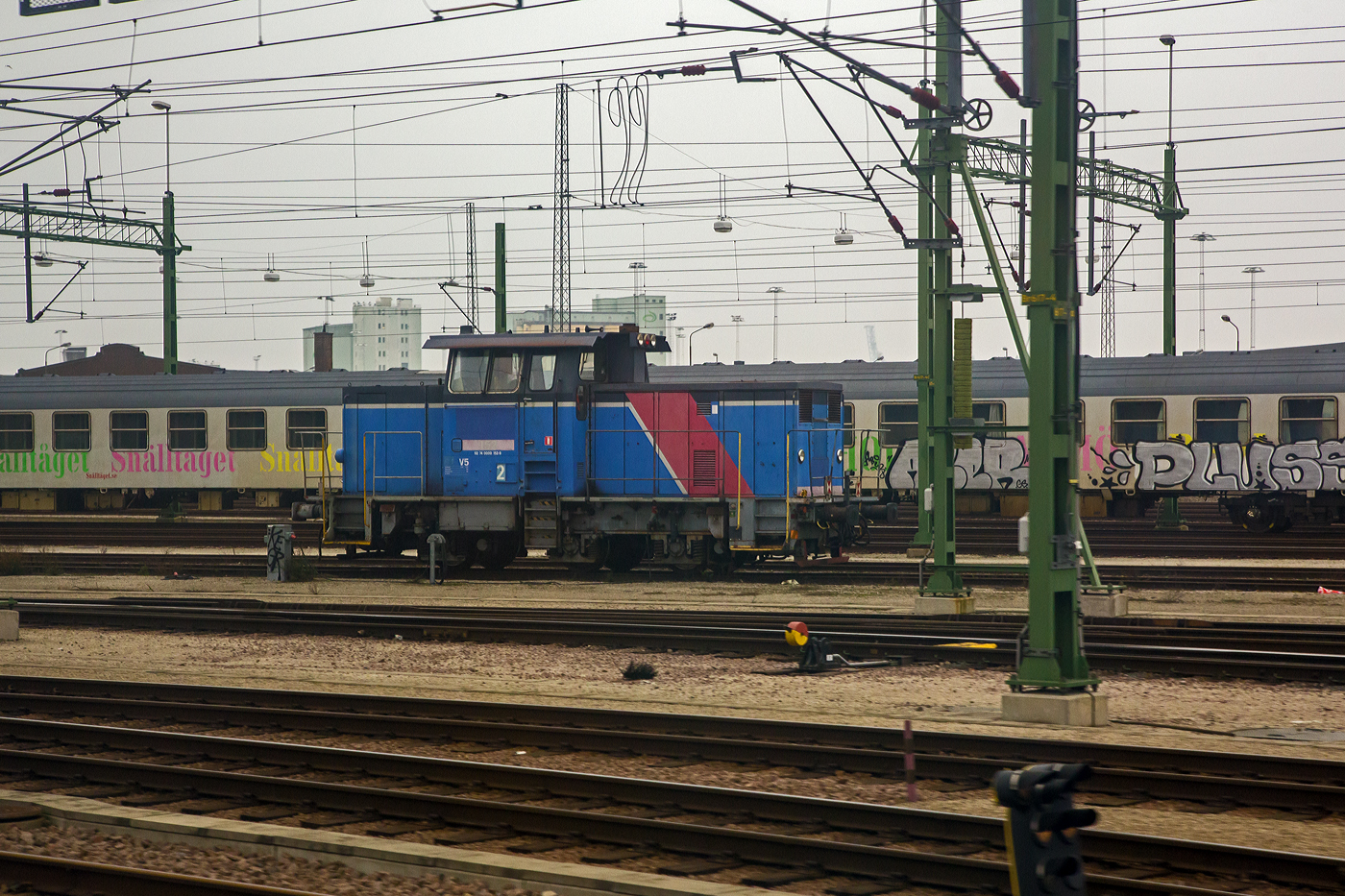 Bei Malmö steht am 20 März 2019 die schwedische Diesellokomotive der Baureihe V5, die GC V5 152 - 92 74 0000 152-9 S-GC, ex SJ V5 152, eine Henschel DHG 625 C. Ein Bild aus dem EC von Kopenhagen nach Stockholm. Die Henschel DHG 625 C wurde 1976 von Henschel & Sohn in Kassel (Deutschland) unter der Fabriknummer 31955 gebaut und die SJ (Statens Järnvägar, ehemaligen schwedische Staatsbahnen) geliefert. Nach der 2001 erfolgten Aufteilung von SJ gingen alle Lokomotiven an die Güterverkehrssparte Green Cargo. Sie werden dort unter der Baureihenbezeichnung GC V5 mit den gleichen Betriebsnummern geführt. Im Jahr 2020 ging Nordic Re-Finance AB und wurde an die VÄTE (VÄxling Terminal) in Trelleborg für den Einsatz im Hafen Trelleborg vermietet. Henschel - DHG 625 C (SJ V 4 bzw. V 5) Unter der Bezeichnung DHG 625 C wurden zwei recht verschiedene Lokomotivtypen für die schwedische Staatsbahn SJ gebaut. Zunächst wurden im Jahr 1973 zehn Lokomotiven geliefert, die als Baureihe V 4 eingereiht wurden. Sie lehnten sich eng an schwedische Konstruktionen an und ähnelten sehr stark den zu jener Zeit in Schweden entstandenen zweiachsigen Loktypen. Ab 1975 folgten 40 weitere DHG 625 C, die sich deutlich von den zuvor gelieferten Lokomotiven unterschieden. Sie hatten ein anderes Fahrwerk, das weitgehend dem der gleichzeitig gebauten Standardlokomotiven entsprach. Die Aufbauten waren rechtwinkliger geworden und das Führerhaus sah deutlich mehr nach dem Henschel-Standard aus. Diese Lokomotiven erhielten bei der SJ die Bezeichnung V5. Alle 50 Lokomotiven gingen im Jahr 2001 in das damals aus der SJ ausgegründete Güterverkehrsunternehmen Green Cargo AB über. Während die V 4 bereits kurz danach vollständig ausgemustert wurde, stehen die V 5 auch heute noch bei Green Cargo im Einsatz. TECHNISCHE DATEN: Anzahl: 40 Hersteller: Henschel & Sohn, Kassel Baujahre: 1975 bis 1978 Spurweite: 1.435 mm (Normalspur) Achsfolge: C Länge über Puffer: 10.640 mm Achsstand : 2 x 2.240 = 4.480 mm Treibraddurchmesser: 985mm (neu) Motor: (KHD) Deutz wassergekühlter 12-Zylinder –Viertakt-Dieselmotor mit Abgasturboaufladung und Ladeluftkühlung vom Typ BF12M716 Dauerleistung: 380 kW (516 PS) Kraftübertragung: Dieselhydraulisch Anfahrzugkraft: 140 kN Höchstgeschwindigkeit: 40 km/h (Rangiergang) / 70 km/h (Streckengang) Dienstgewicht: 48,0 t Die GC V5 152 wurde 2001 mit einem V12-Zylinder-Dieselmotor vom Typ GM 12V-149 mit einer Leistung von 440 kW (600 PS) remotorisiert