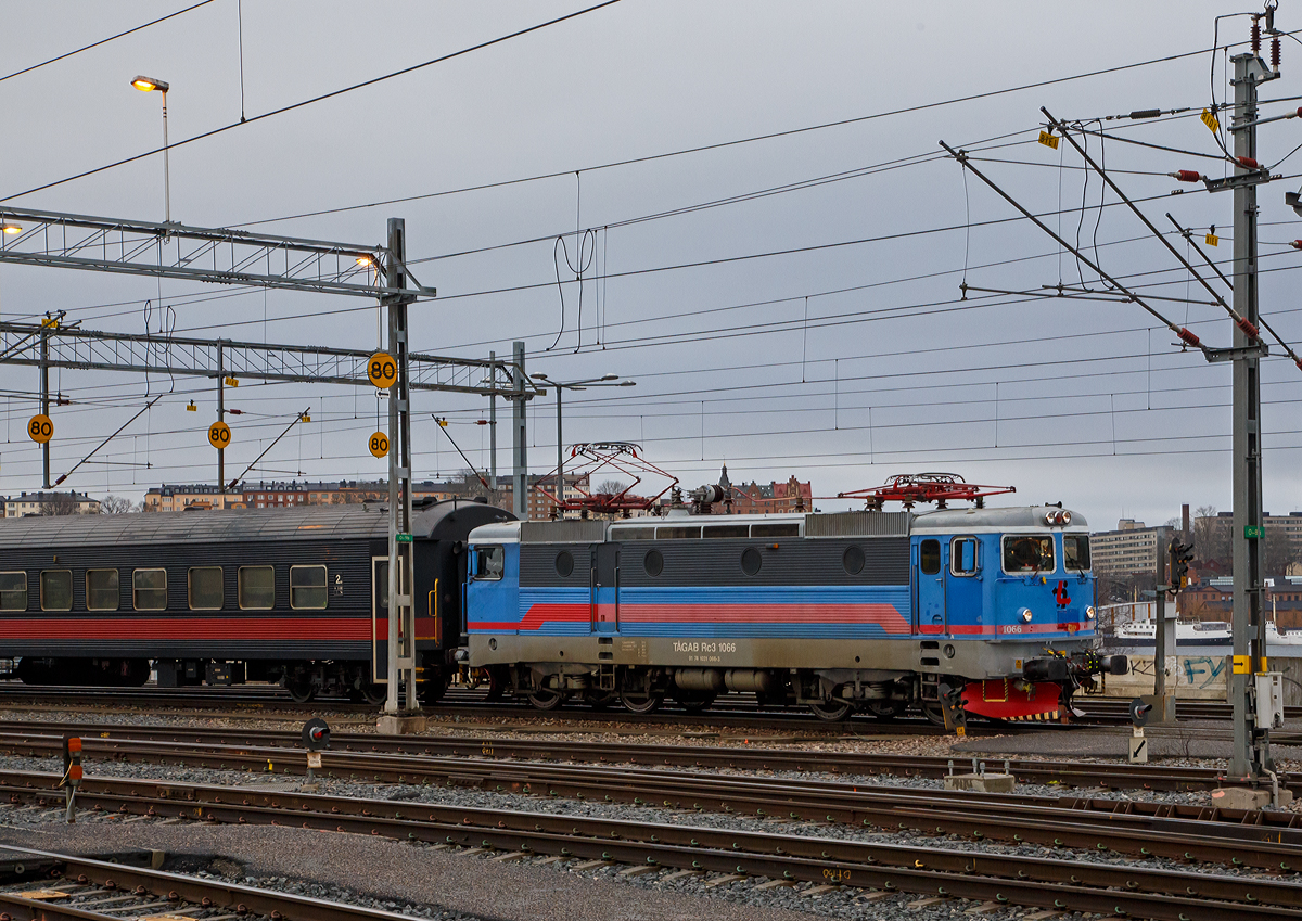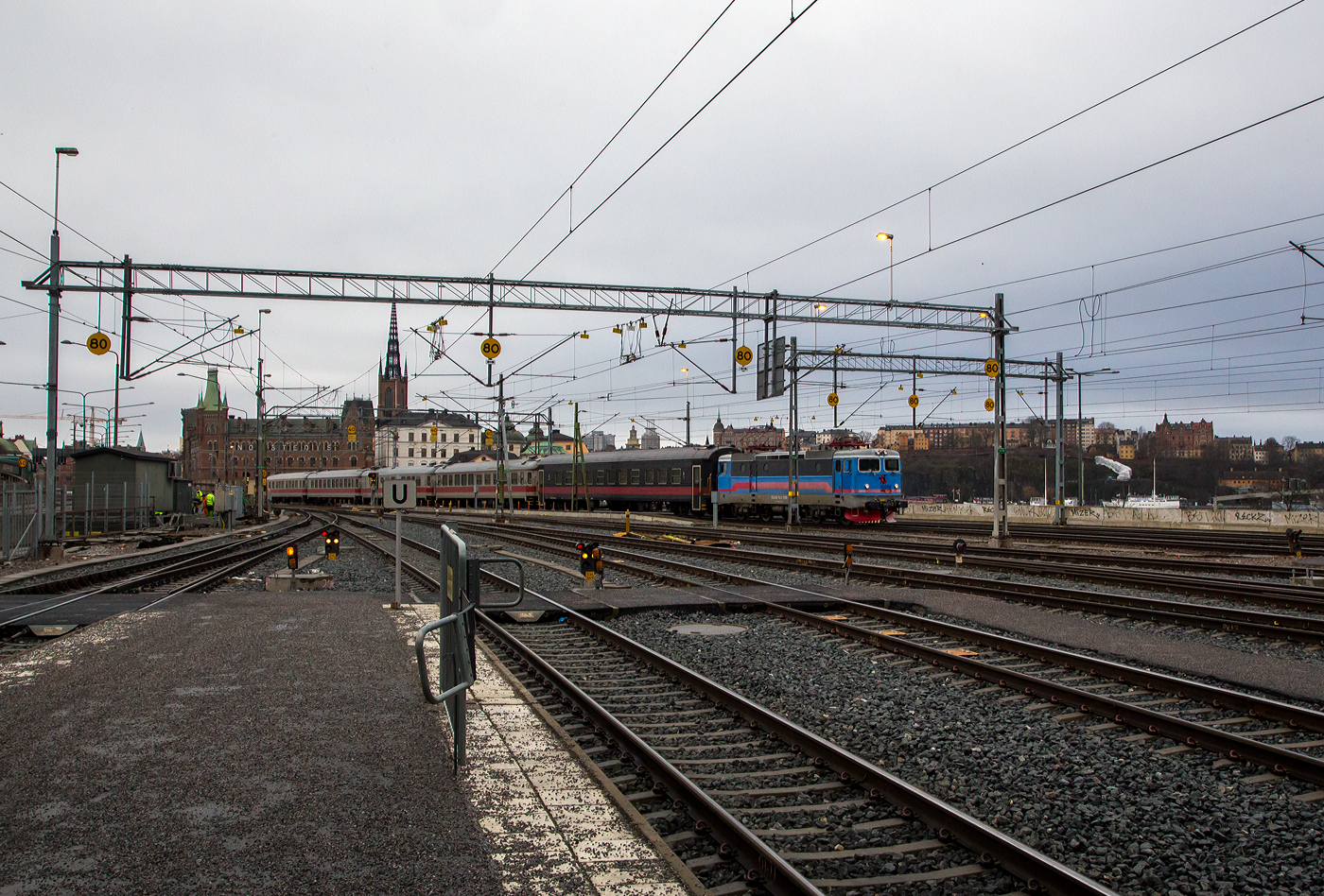 Der schwedische 1./2. Klasse Reisezugwagen S-TÅGAB 50 74 3873 875-3 der Gattung AB3 (ex SJ AB3 4875) am 20 März 2019 eingereiht im Zugverband von einem Personenzug im Bahnhof Stockholm Central.