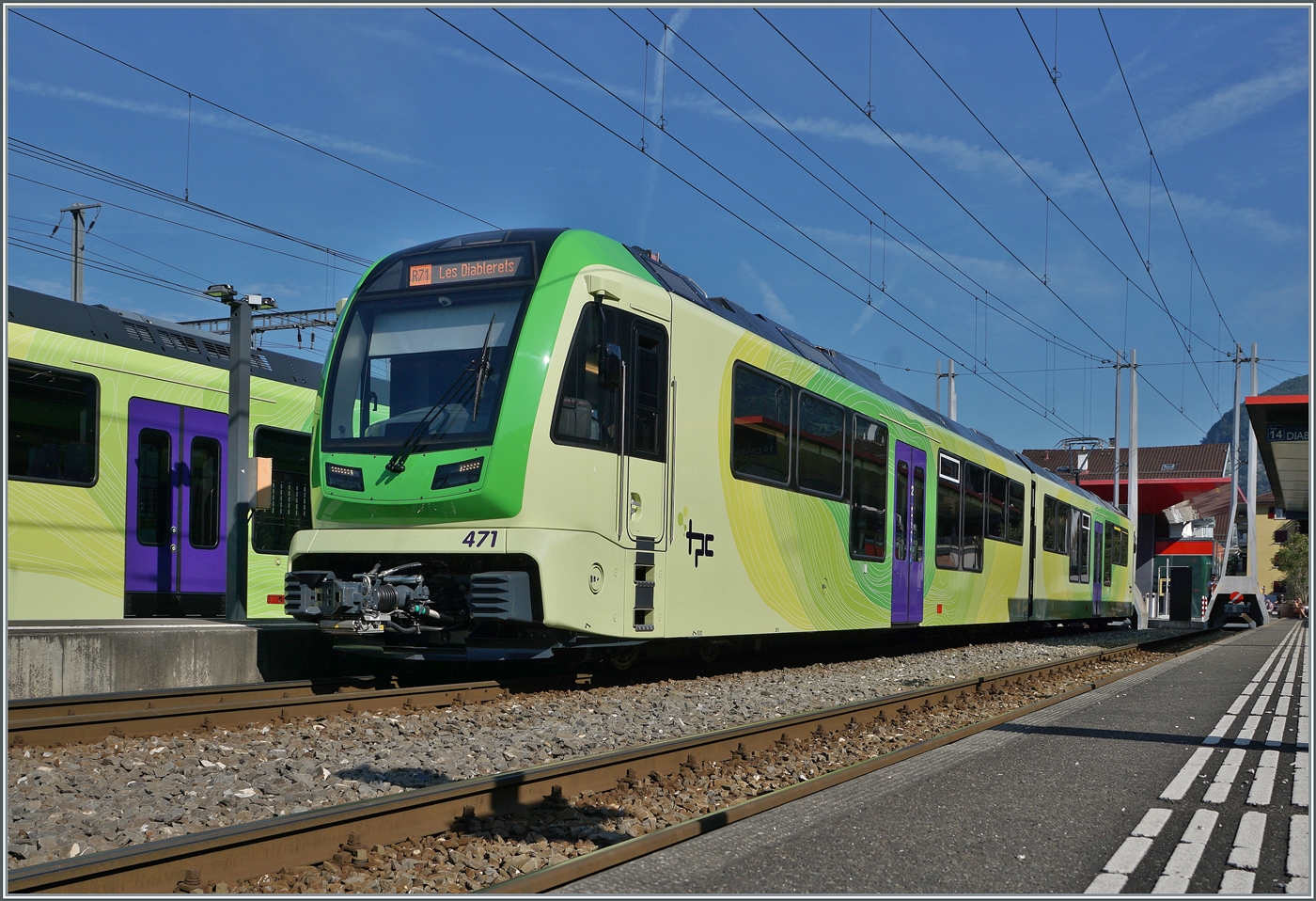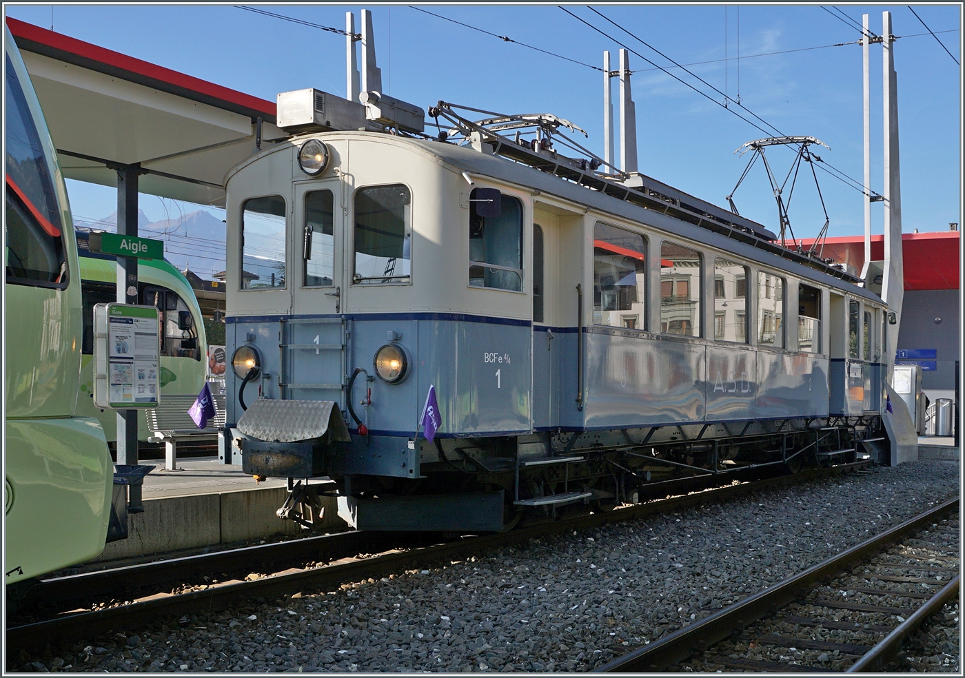 Der AL Regionalzug R 323 ist von Leysin in Aigle angekommen und wartet nun auf die Rückfahrt nach Leysin. Der Zug bestehend aus dem BDeh 4/4 302"Leysin" und Bt 351 "Aigle". Es ist die letzte braune Komposition der A-L, alle anderen Reise-Züge tragen das TPC-Farbschema. 4. Juni 2023