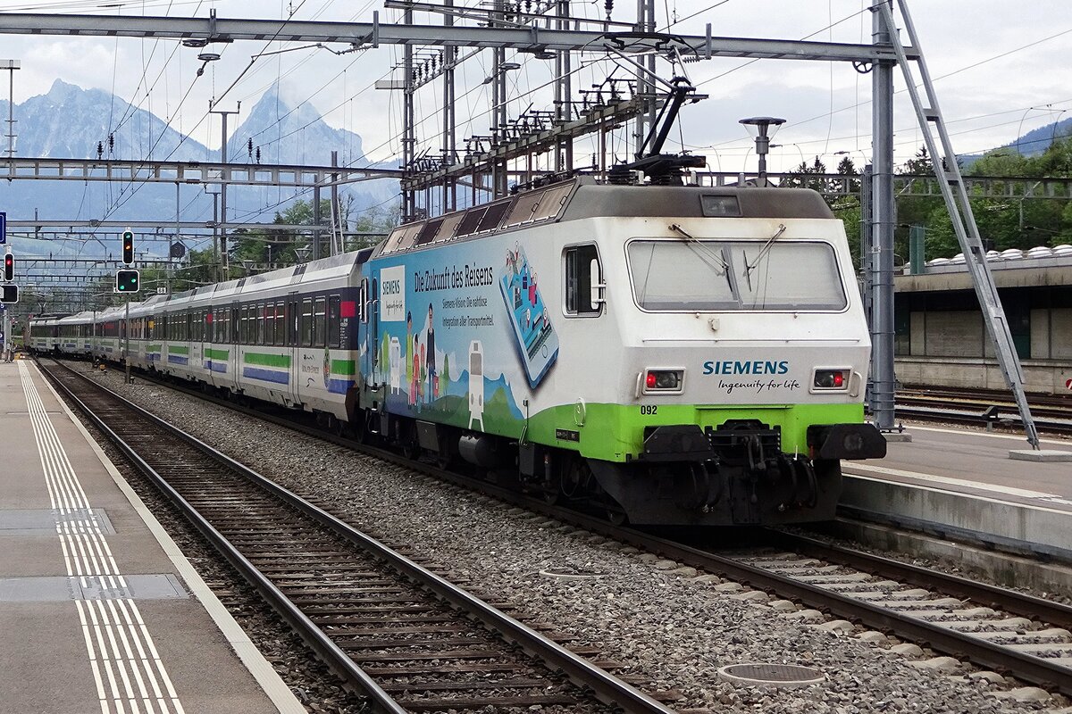 Ausfahrt Richtung Zug von einem Interregio mit Swiss Express Re 4/4 II 11108 aus Arth-Goldau.
