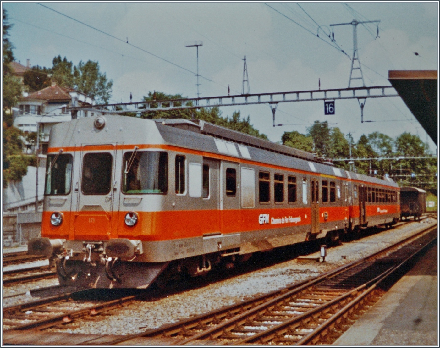Ex Travys RBDe 560 174 unterm Regenbogen, daneben der Steuerwagen des Montafoner NPZ BS 10.221 und rechts der Montafoner Kurztriebwagen und dahinter der neue Steuerwagen der OeBB. Juni 2023.