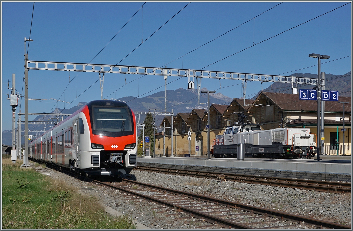 Nach längerem Suchen endlich gefunden bzw. die Gelegenheit bekommen ein Foto zu bekommen: in Bex steht der neue RegionAlps RABe 533 703. Dahinter der SBB RABe 531 002. Interessanterweise ist der "RegionAlpes Triebzug trotz unterschiedlicher Farbgebung, einer anderen Einteilung der 1. Klasse und einer anderen Baureihen Bezeichnung ein SBB Triebzug, wie jedenfalls die UIC Nummer verkündet: RABe 94 85 0 533 703-0 CH-SBB. 30. Oktober 2024 Stefan Wohlfahrt