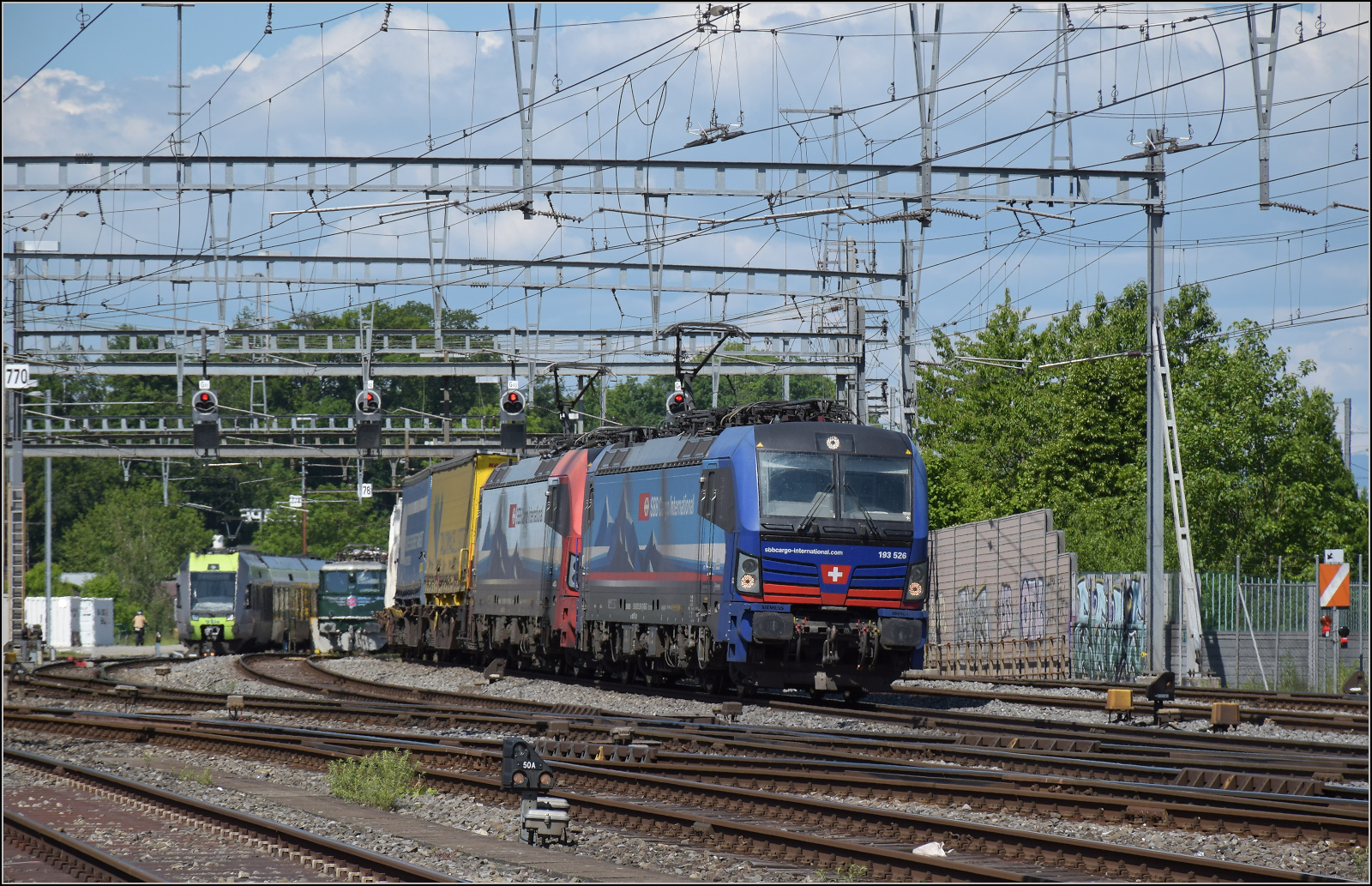 Tem 225 041 der BLS Stiftung rangiert die Wagen des Schnaaggi Schaaggi im Bahnhof Burgdorf. Mai 2025.