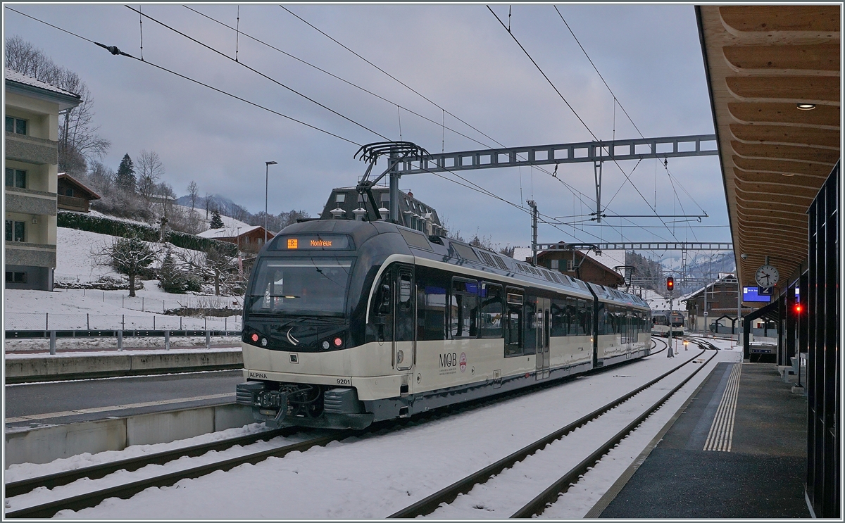 Der ABe 2/4 - B Be 2/4 104 wartet in Montbovon auf die Abfahrt als S50 nach Palézieux.